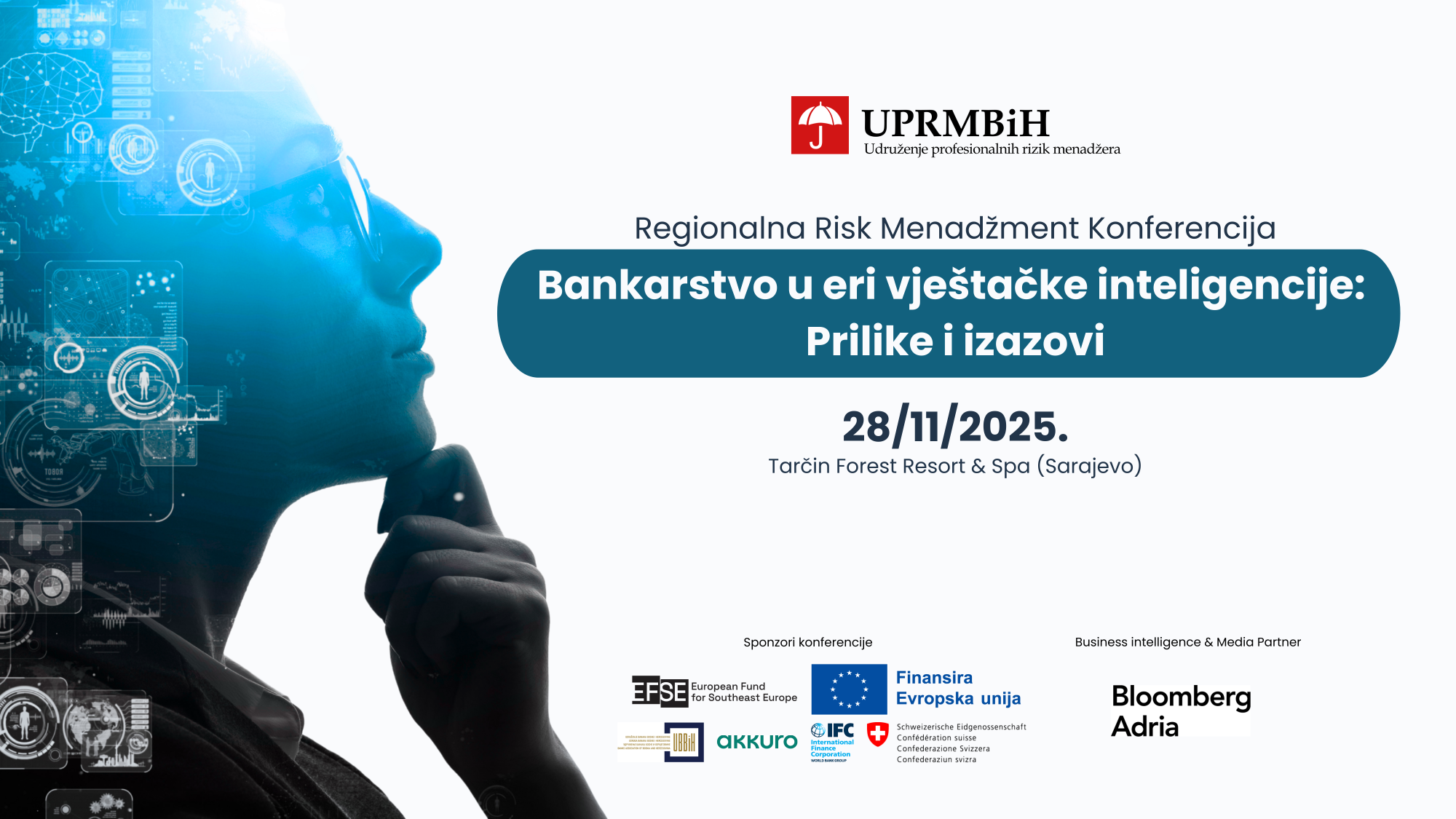 Udruženje profesionalnih rizik menadžera u BiH (UPRMBiH) organizira Regionalnu Risk Menadžment Konferenciju, koja će biti održana 28. novembra 2025. godine u hotelu Tarčin Forest Resort & Spa. Konferencija će okupiti vodeće eksperte iz bankarskog, finansijskog i tehnološkog sektora, a centralna tema bit će kako vještačka inteligencija mijenja poslovne modele te načine rada savremenog bankarstva.