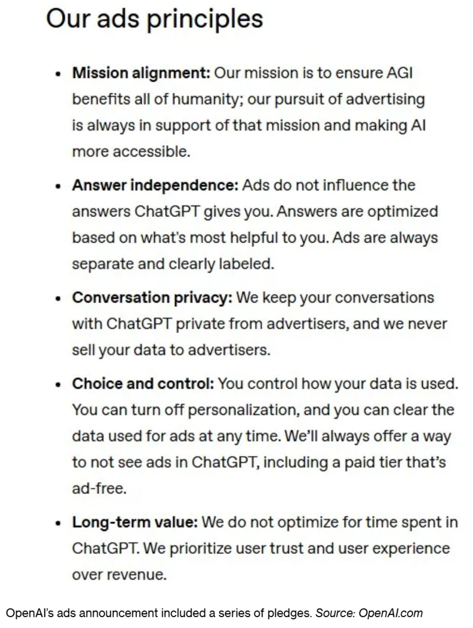 Posljednje obećanje koje je OpenAI dao bit će i najteže ispuniti. Kažu kako neće "optimizirati prema vremenu provedenom u ChatGPT-ju", odnosno da neće model trenirati da korisnike drže uključenima u razgovor što je dulje moguće kako bi bili izloženi oglasima. Ne samo da će ovo obećanje biti teško ispuniti, već ga je teško i mjeriti.
