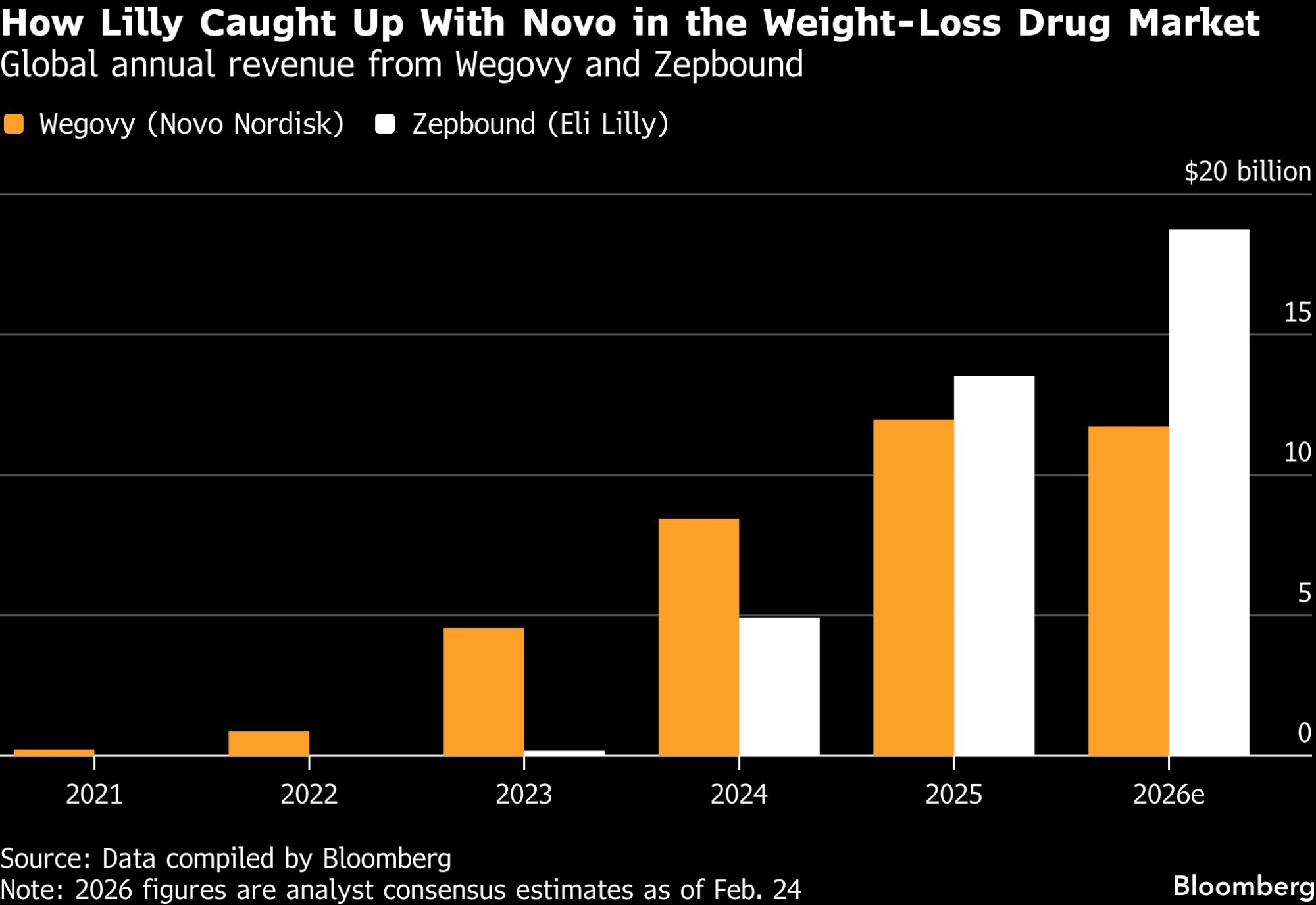 Međutim, iako je Eli Lilly & Co. kasnila i tek 2023. lansirala svoju injekciju za gojaznost "zepbound", taj lijek je prilikom direktnog poređenja pokazao bolje rezultate u mršavljenju od Wegovyja. Prošle godine prodaja "zepbounda" u dolarima nadmašila je "wegovy", a više analitičara reklo je Bloomberg da očekuju da će "zepbound" dodatno povećati prednost tokom 2026. godine.