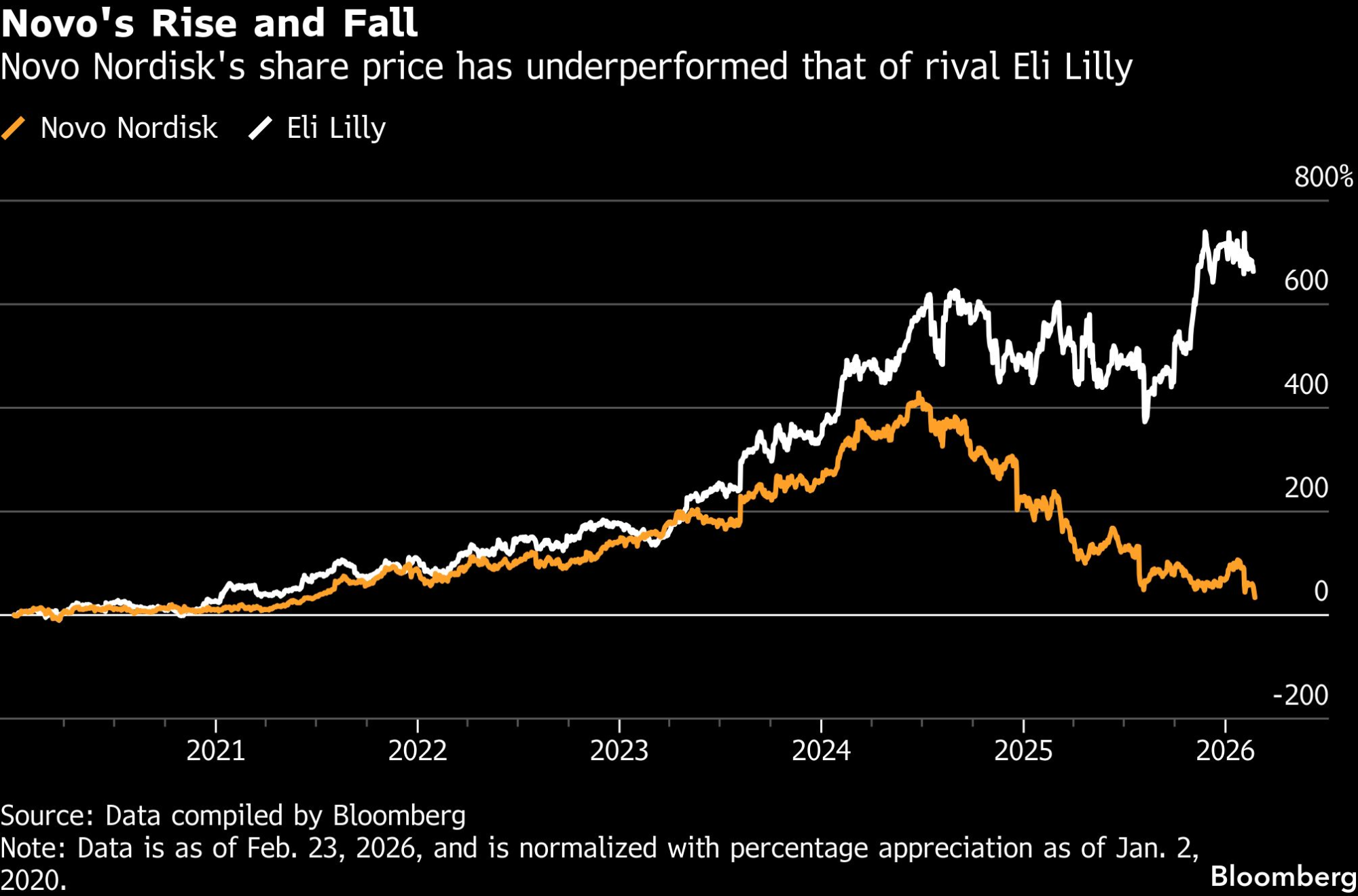 Međutim, gotovo svi ti dobici zbog rasta akcija su izbrisani zbog snažne konkurencije jeftinijih kopija i glavnog rivala, kompanije Eli Lilly & Co. Tome su doprinijeli i rezultata kliničkih ispitivanja lijeka nove generacije za gojaznost Novo Nordiska koji su podbacili. Kako cijene lijekova nastavljaju da padaju, dijelom zbog nastojanja Trumpove administracije da ih učini pristupačnijim, Novo Nordisk je upozorio da će im ukupna prodaja ove godine biti manja.