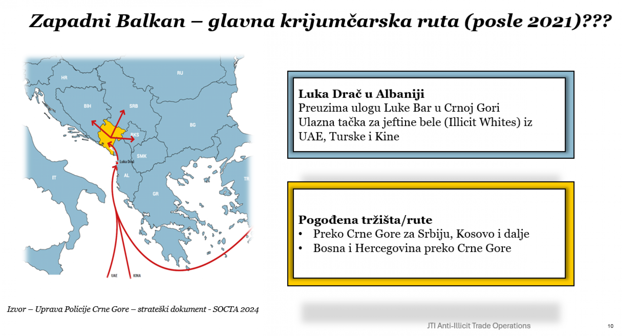 Zinaida Babović, menadžer JTI za korporativne poslove i komunikacije za BiH, Sjevernu Makedoniju, Crnu Goru, Kosovo i Albaniju, dodala je da je luka Drač u Albaniji preuzela djelimično ulogu luke Bar. Identifikovane su rute preko Crne Gore i Kosova kojima se vrši krijumčarenje robe u Srbiju i BiH, i dalje prema EU.