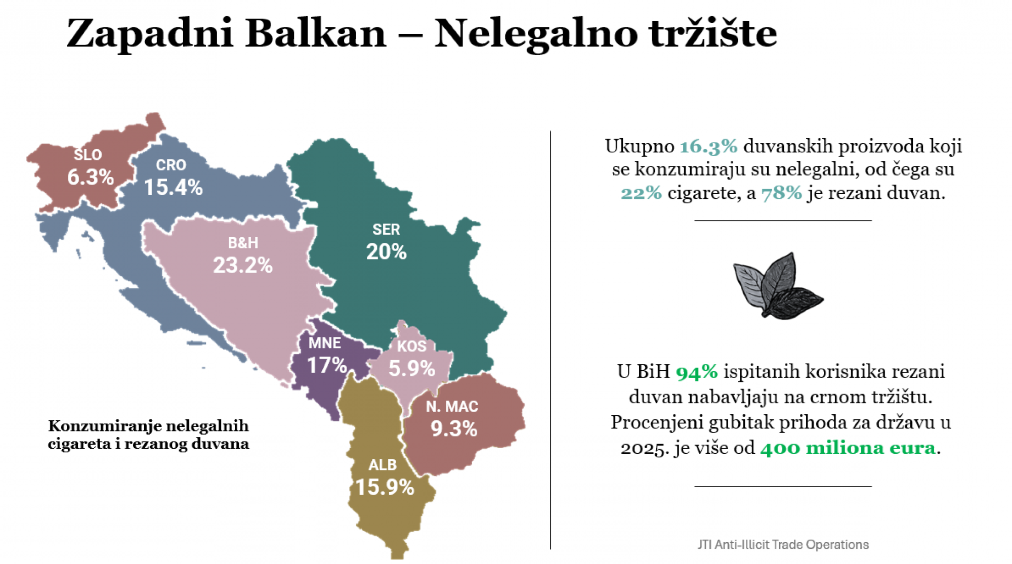 Na zapadnom Balkanu je 16,3 odsto duvanskih proizvoda koji se konzumiraju nelegalno, a od toga su 22 odsto cigarete, 78 odsto je rezani duvan. Prema istraživanju u BiH, 94 odsto ispitanika koristi rezani duvan koji nabavlja na crnom tržištu.