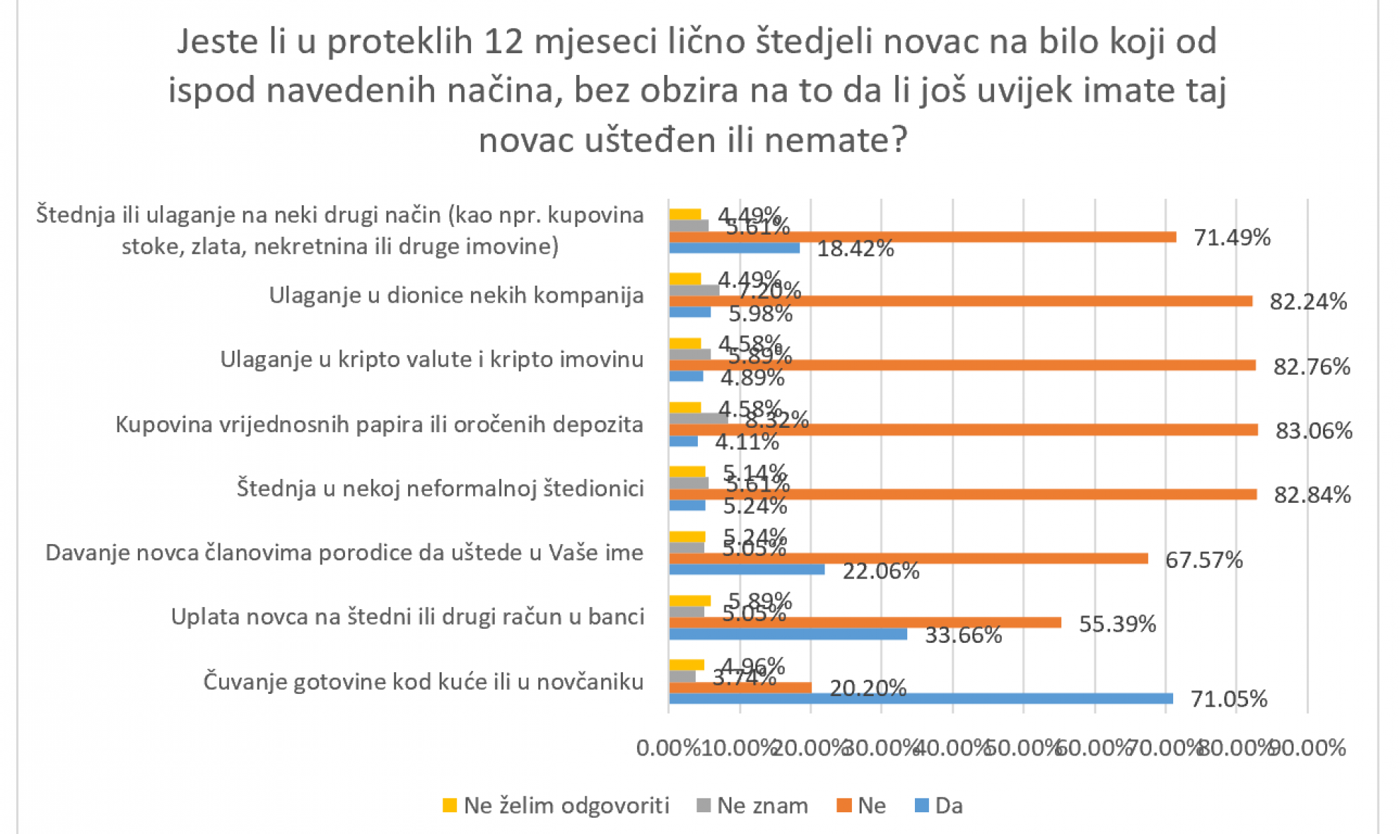 Ipak, gotovo 18,5 posto ispitanika navodi da druge osobe upravljaju njihovim novcem, a manji postotak (oko sedam posto) nije sigurno ili nije željelo odgovoriti, što ukazuje na nedostatak samostalnosti ili iskustva u finansijskom upravljanju.