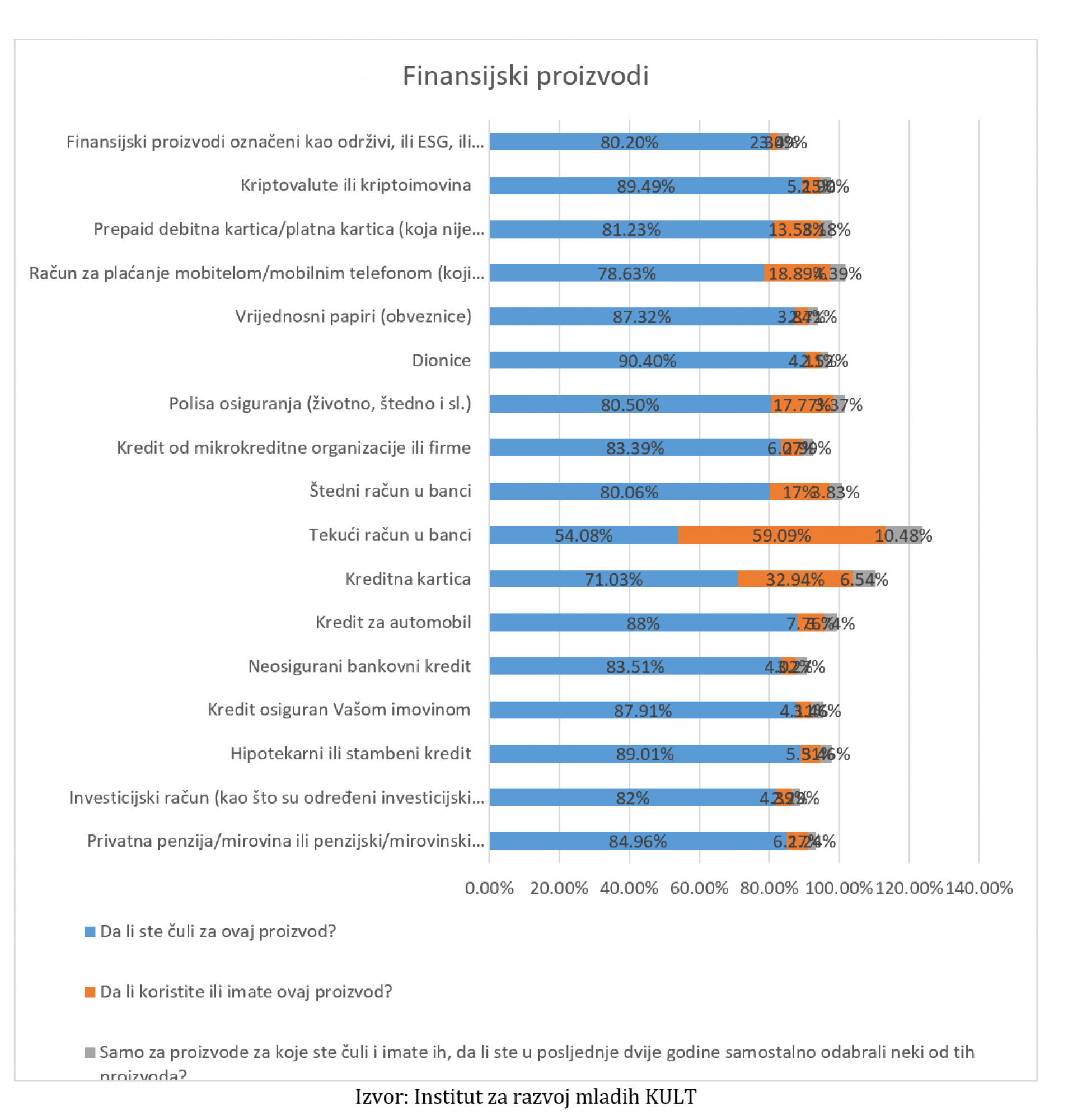 Složeni finansijski proizvodi, kao što su dionice, vrijednosni papiri, kriptovalute i održivi ESG proizvodi, poznati su većini ispitanika (od 80 posto do gotovo 90 posto), ali ih aktivno koristi manje od šest posto, a samostalno bira još manji broj.