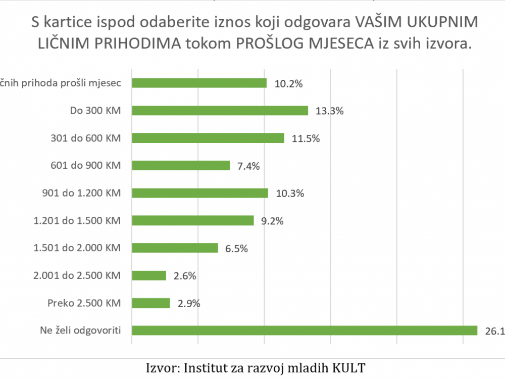Podaci o prihodima pokazuju da najveći dio mladih zarađuje niske ili srednje iznose, dok manji dio ostvaruje primanja iznad prosjeka. Primjetan je i disbalans spolova kod primanja iznad 1.500 KM, gdje muškarci čine znatno veći udio.