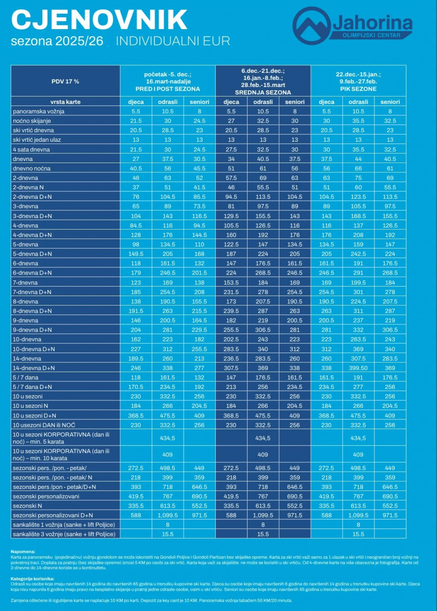 Na Ponijerima kod Kaknja skijaška sezona počinje uz iste cijene kao i prošle godine. Poludnevna karta, koja vrijedi od 10:00 do 13:00 ili od 13:00 do 16:00 sati, košta 10 KM, dok cijena dnevne karte iznosi 15 KM. Noćno skijanje je 10 KM, što čini Ponijere pristupačnim za sve posjetioce.