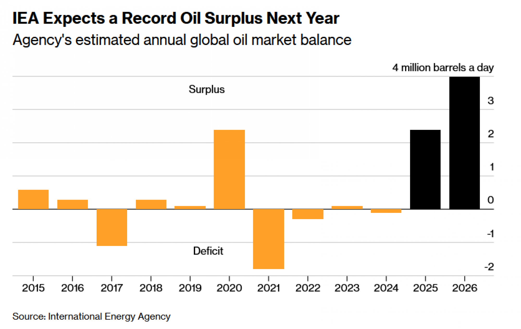 Ova godina trebala bi kulminirati prvim značajnim viškom od 2020. godine. Međunarodna agencija za energiju je u novembru prognozirala da će globalna ponuda premašiti potražnju za 2,4 miliona barela dnevno, a očekuje se da će se sljedeće godine taj jaz povećati na rekordna četiri miliona barela dnevno.