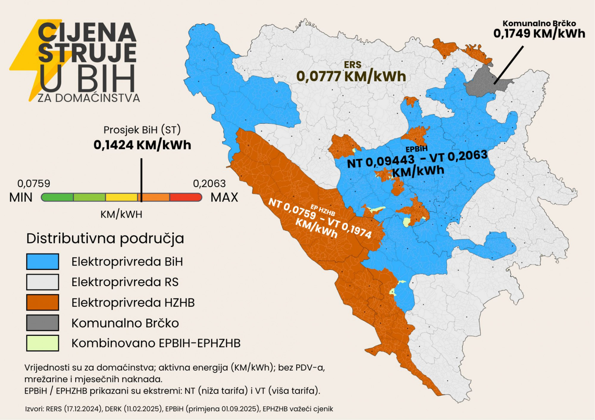 Računi za struju u Bosni i Hercegovini (BiH) razlikuju se od domaćinstva do domaćinstva, iako svi žive u istoj državi. BiH ima četiri glavna snabdjevača električnom energijom Elektroprivredu BiH, Elektroprivredu HZHB, Elektroprivredu RS i Komunalno Brčko, a svaki koristi vlastiti sistem obračuna. Kako objašnjava energetski analitičar Kemal Obad, cijene nisu rezultat tržišnog natjecanja, već ih administrativno određuju regulatorne agencije FERK, RERS i DERK.