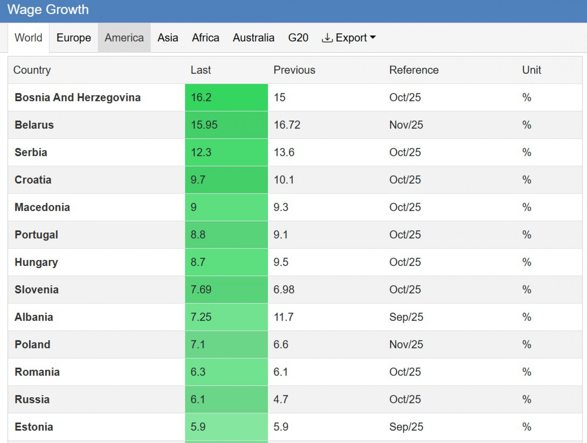 Bosna i Hercegovina (BiH) zemlja je s procentualno najvišim rastom plata na svijetu, objavila je ovo jedna od vodećih svjetskih platformi za ekonomske i finansijske podatke Trading Economics. Prema njihovim podacima, plate u BiH su u oktobru 2025. godine bile veće za 16,2 posto u odnosu na isti period 2024. godine. I u ranijoj analizi ova zemlja je bila u samom vrhu, s rastom plata od oko 15 posto, što potvrđuje kontinuitet snažnog nominalnog povećanja zarada.