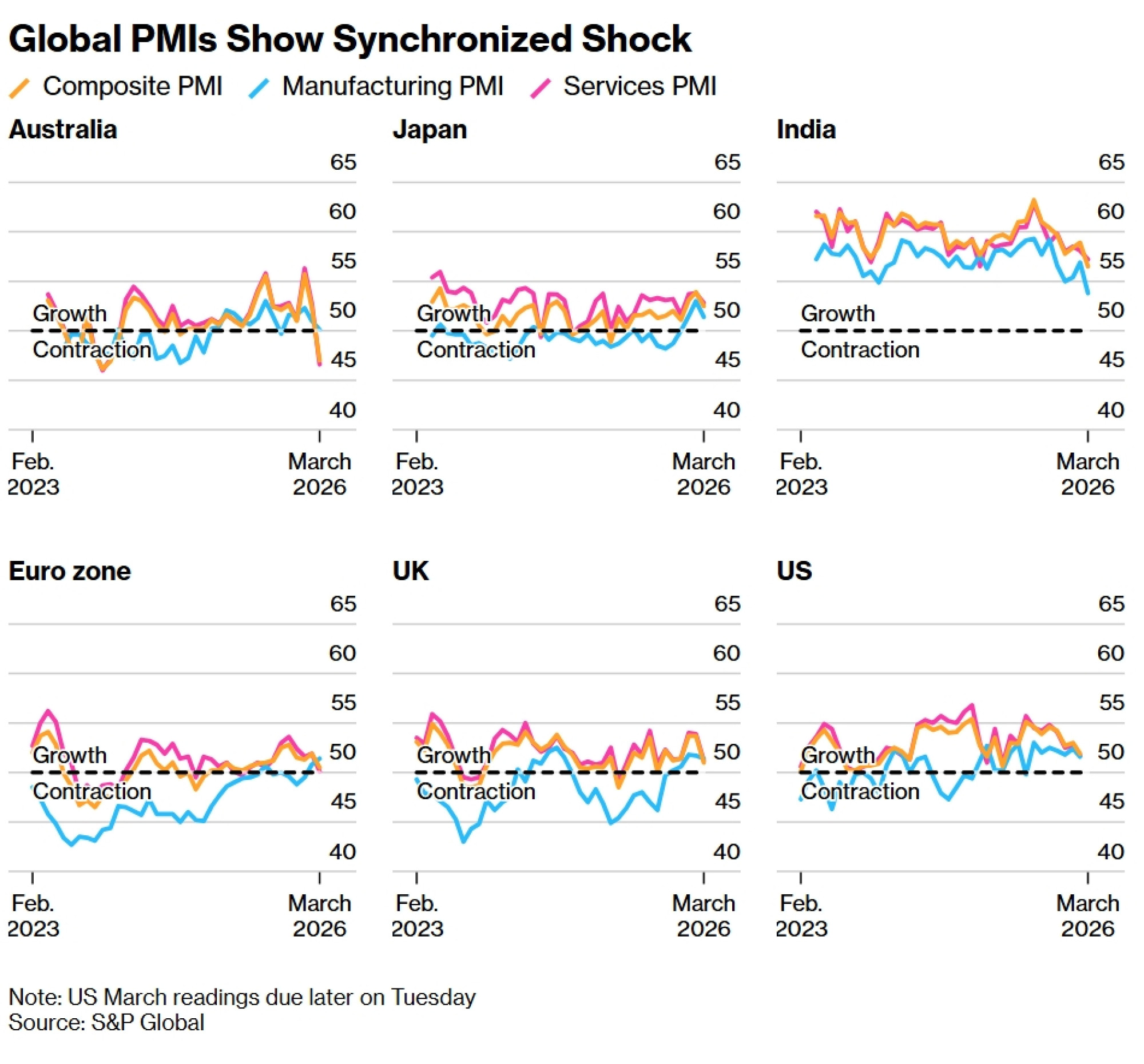 "Prije nego što je izbio rat s Iranom, naš globalni praćenik rasta sugerirao je da svjetsko gospodarstvo dobiva na zamahu", rekao je Jamie Rush, direktor globalne ekonomije u Bloomberg Economicsu. "Podaci PMI-ja koji pristižu iz naprednih gospodarstava sugeriraju da je oporavak u nastajanju u opasnosti da bude ugušen kombinacijom viših troškova nafte, strožih financijskih uvjeta i posustalog sentimenta."
