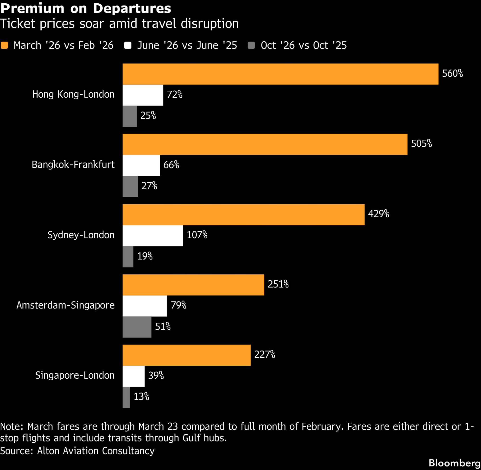 Poremećaji na ovom koridoru dodatno pojačavaju pritisak na cijene. Karta iz Hong Konga za londonski aerodrom Heathrow prosječno je koštao 3.318 dolara na dan 23. marta, što predstavlja rast od 560 posto u odnosu na prethodni mjesec, navodi Alton Aviation. Cijene letova Bangkok–Frankfurt skočile su za 505 posto na 2.870 dolara. Klasična ruta između Australije i Velike Britanije također je pogođena, a cijene karata iz Sidneja za London su u istom periodu porasle za 429 posto.