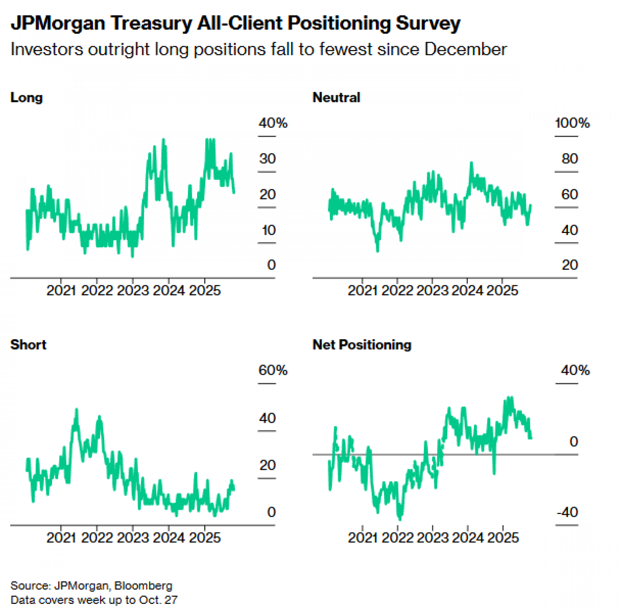 Za sedmicu koja je završila 27. oktobra, neto duge i kratke pozicije klijenata pale su za po dva postotna boda, dok je neutralno pozicioniranje poraslo za četiri postotna boda. Duga izloženost sada je na najnižem nivou od decembra.