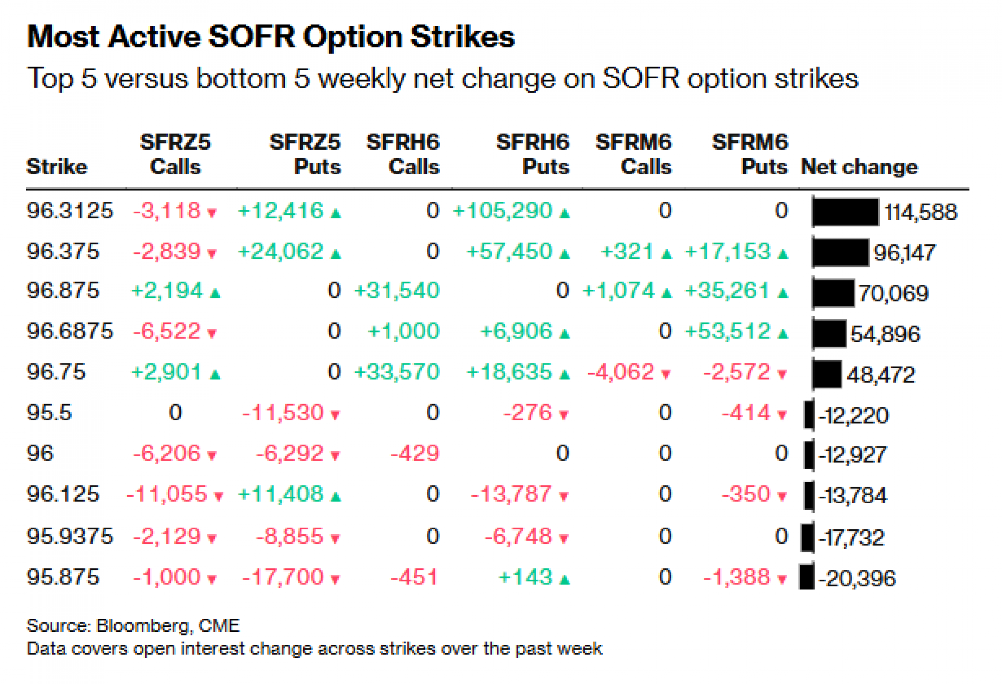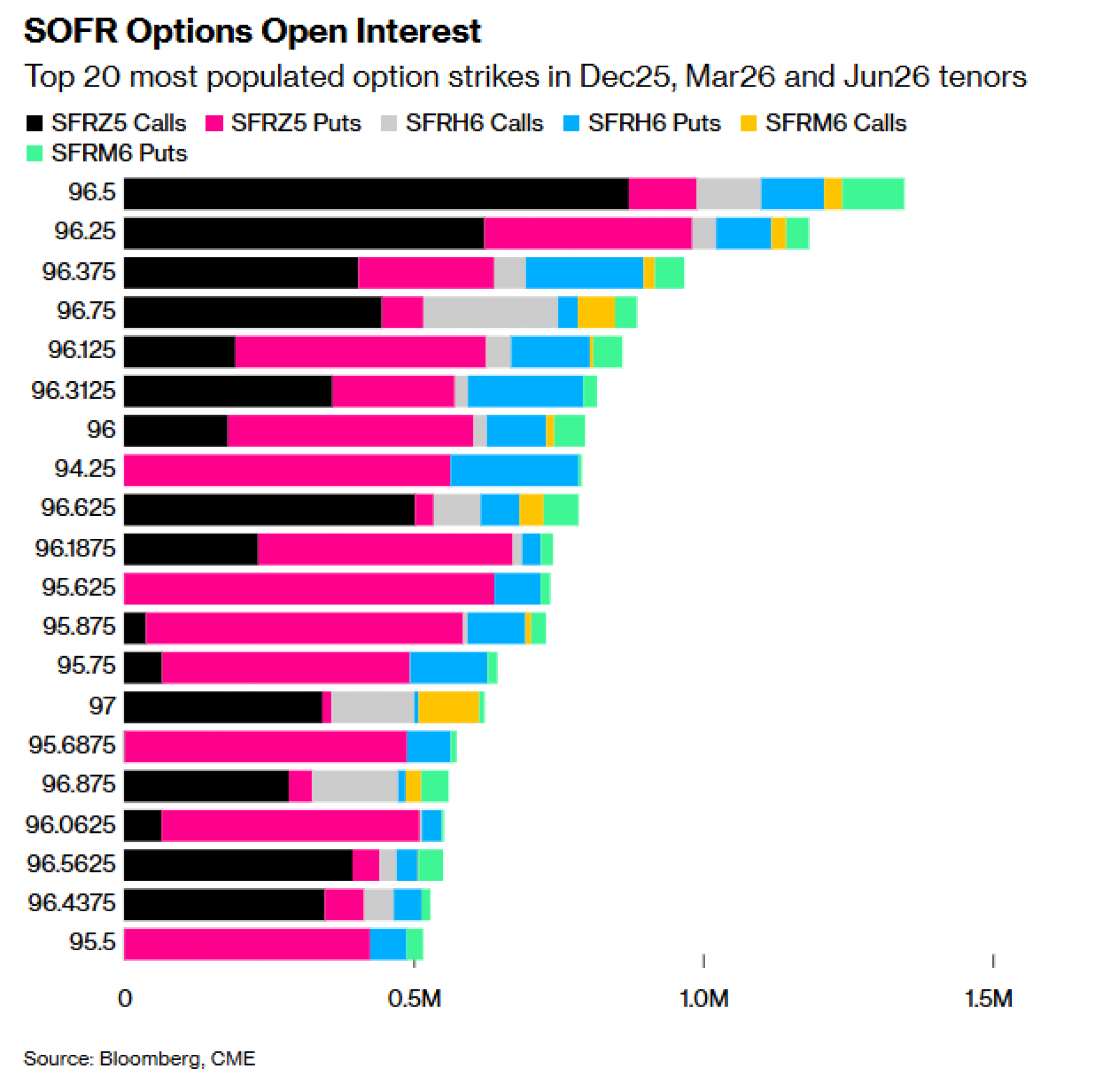 Najaktivniji je nivo 96.50, uglavnom zbog velike izloženosti u Dec25 call opcijama. Nedavni tokovi uključuju kupovinu SFRZ5 96.50 call opcija te kupovinu SFRZ5 96.50/96.5625 i SFRZ5 96.50/96.625 call spreadova. Značajan otvoreni interes i dalje postoji na nivou 96.25, uz nedavne transakcije poput SFRZ5 96.25/96.125 put spreadova, SFRH6 96.375/96.25 1x2 put spreadova i SFRH6 96.75/96.25/96.4375 put "drveća".