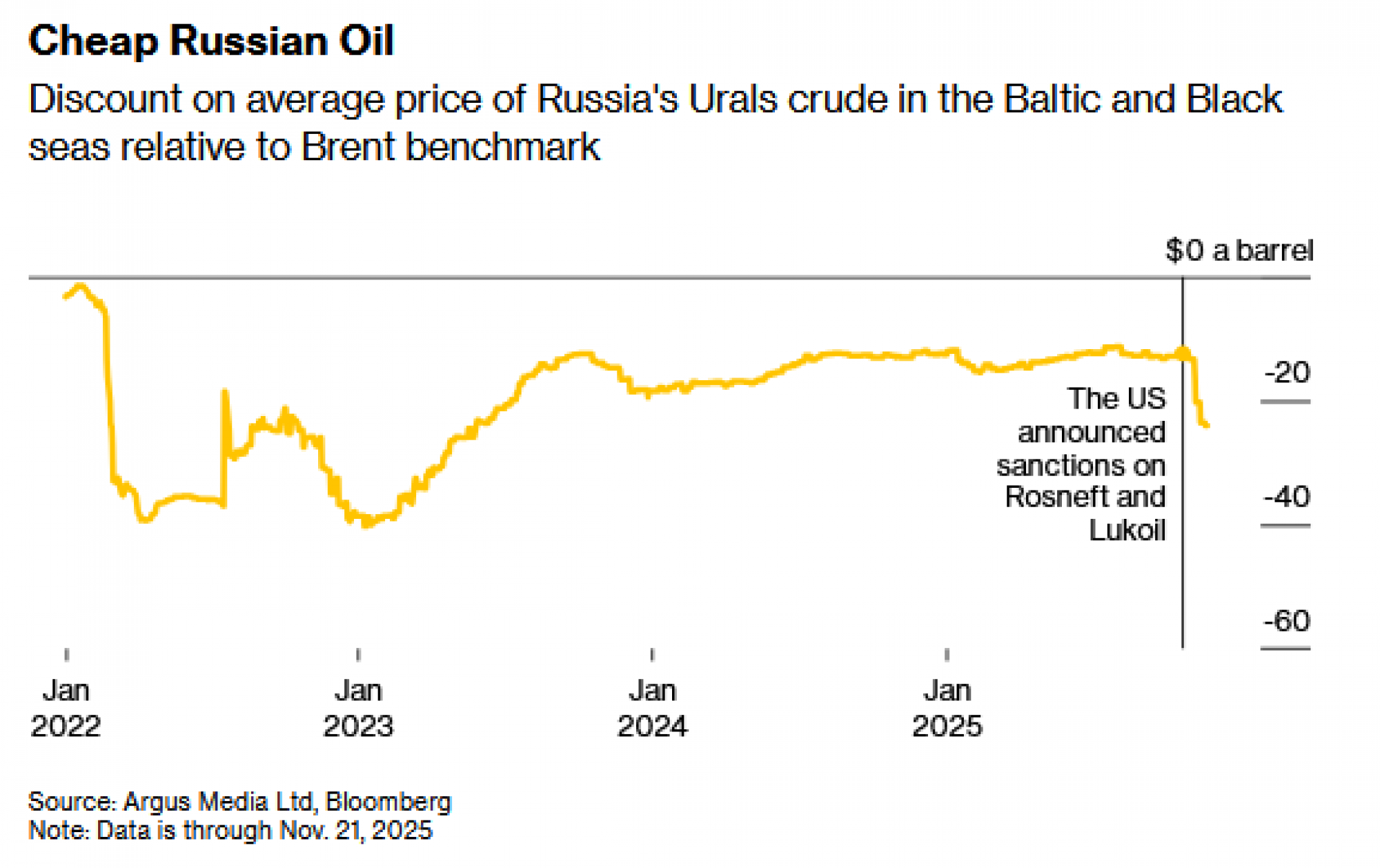 Kako je američka zabrana poslovanja s Rosnjeftom i Lukoilom počela stupati na snagu u studenom, ruska vodeća mješavina Urals bila je više od 20 dolara po barelu jeftinija od Brenta, prema podacima tvrtke Argus Media. Iako je ta razlika znatno manja nego u ranijim godinama rata u Ukrajini, i dalje je znatno veća od povijesnog popusta od dva do četiri dolara.