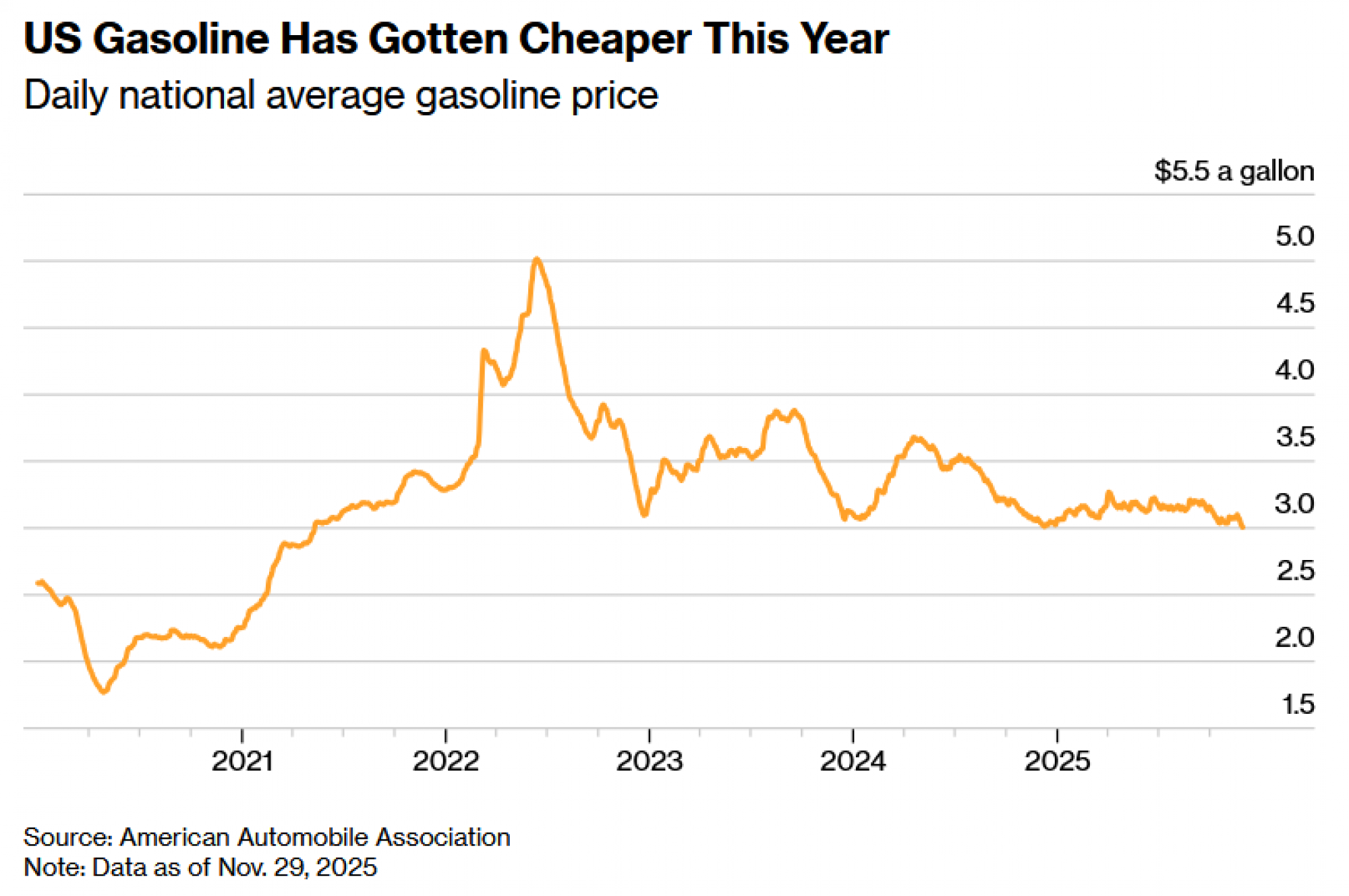 Nešto više od 10 mjeseci nakon početka drugog mandata, prosječna nacionalna cijena benzina pala je za oko 12 centi, iako još nije pala ispod tri dolara po galonu, razine koja je posljednji put zabilježena 2021. godine. Daljnja smanjenja cijena goriva mogla bi biti ograničena prekidima rada ključnih rafinerija nafte u Aziji i Africi, kao i trajnim zatvaranjima diljem Europe i SAD-a.