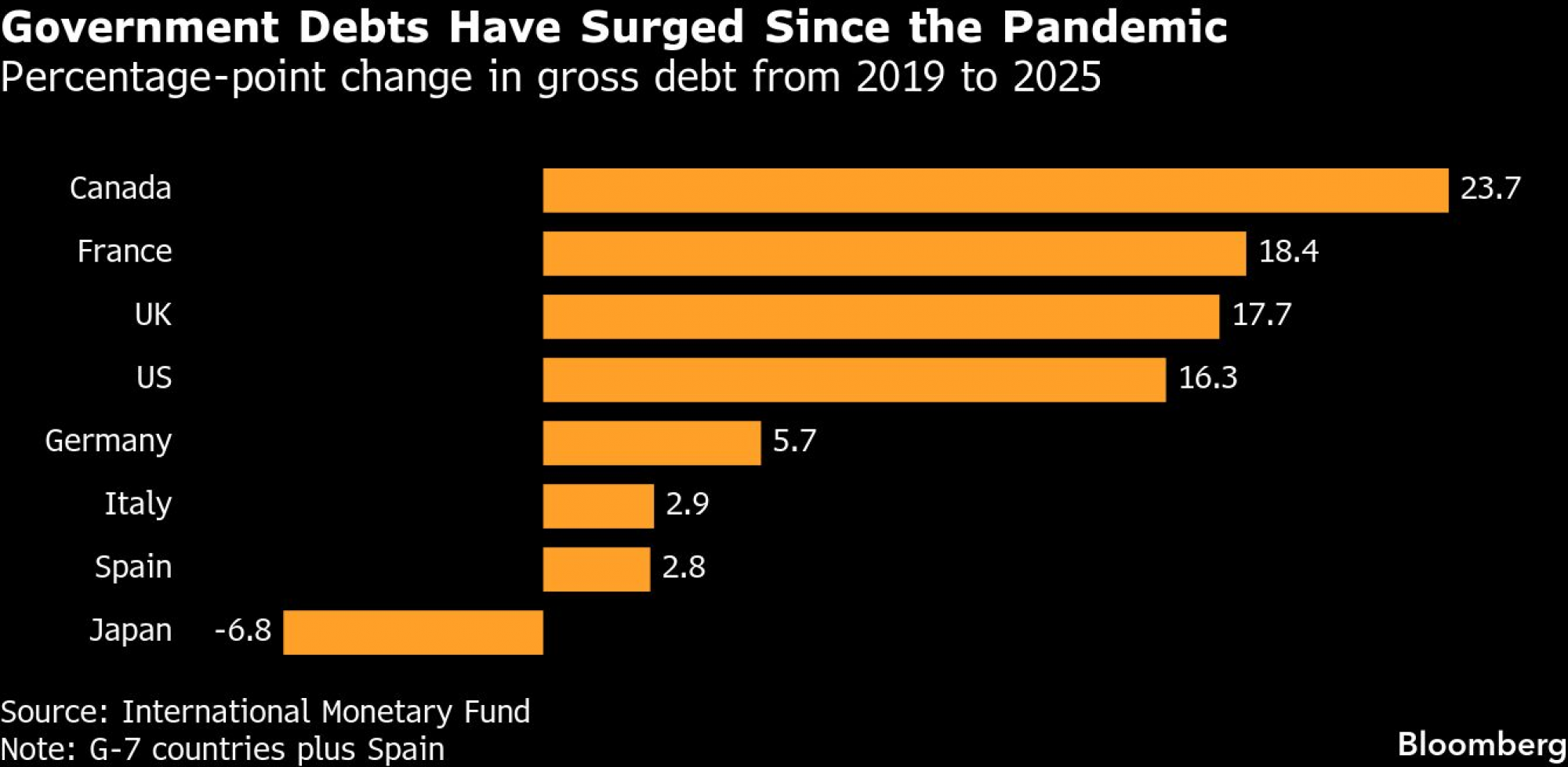 Državni dugovi su naglo porasli od pandemije - promjena bruto duga u procentnim poenima od 2019. do 2025 | Bloomberg