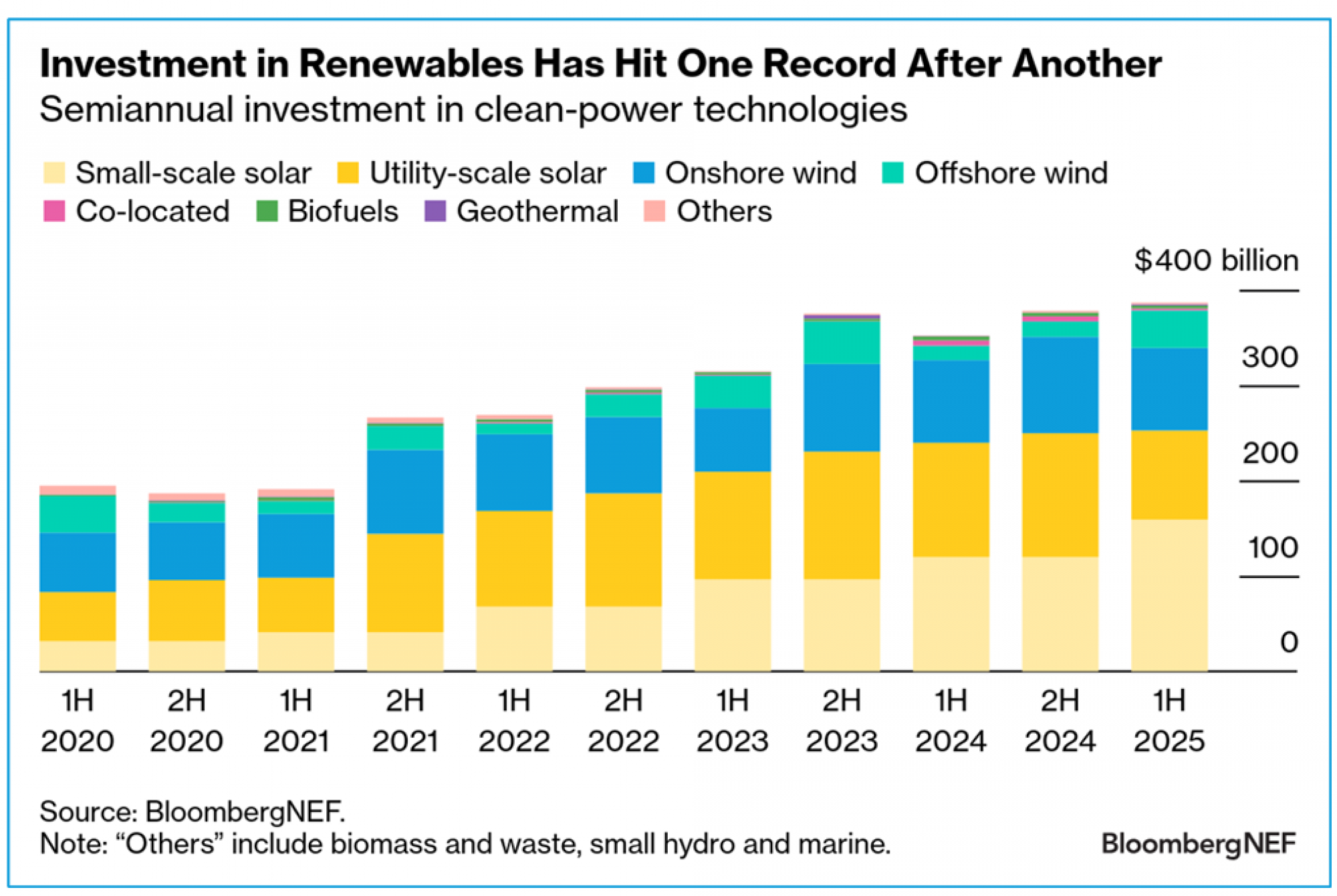 Druga velika priča o uspjehu je o razmjeru u kojem su se vjetroelektrane i solarne elektrane proširile, i to industrijskim tempom, praktički posvuda. U prvom polugodištu 2025. ulaganja u obnovljive izvore energije ponovno su dosegnula rekord, unatoč nastojanjima administracije američkog predsjednika Donalda Trumpa da uspori razvoj čiste energije u SAD-u. Projekti vjetra i solara privukli su ukupno 386 milijardi dolara, što je porast od deset posto u odnosu na isto razdoblje prošle godine. Ulaganja u solarna postrojenja povećana su na 252 milijarde dolara, a u vjetroelektrane na 126 milijardi dolara, pokazuju podaci BloombergNEF-a.