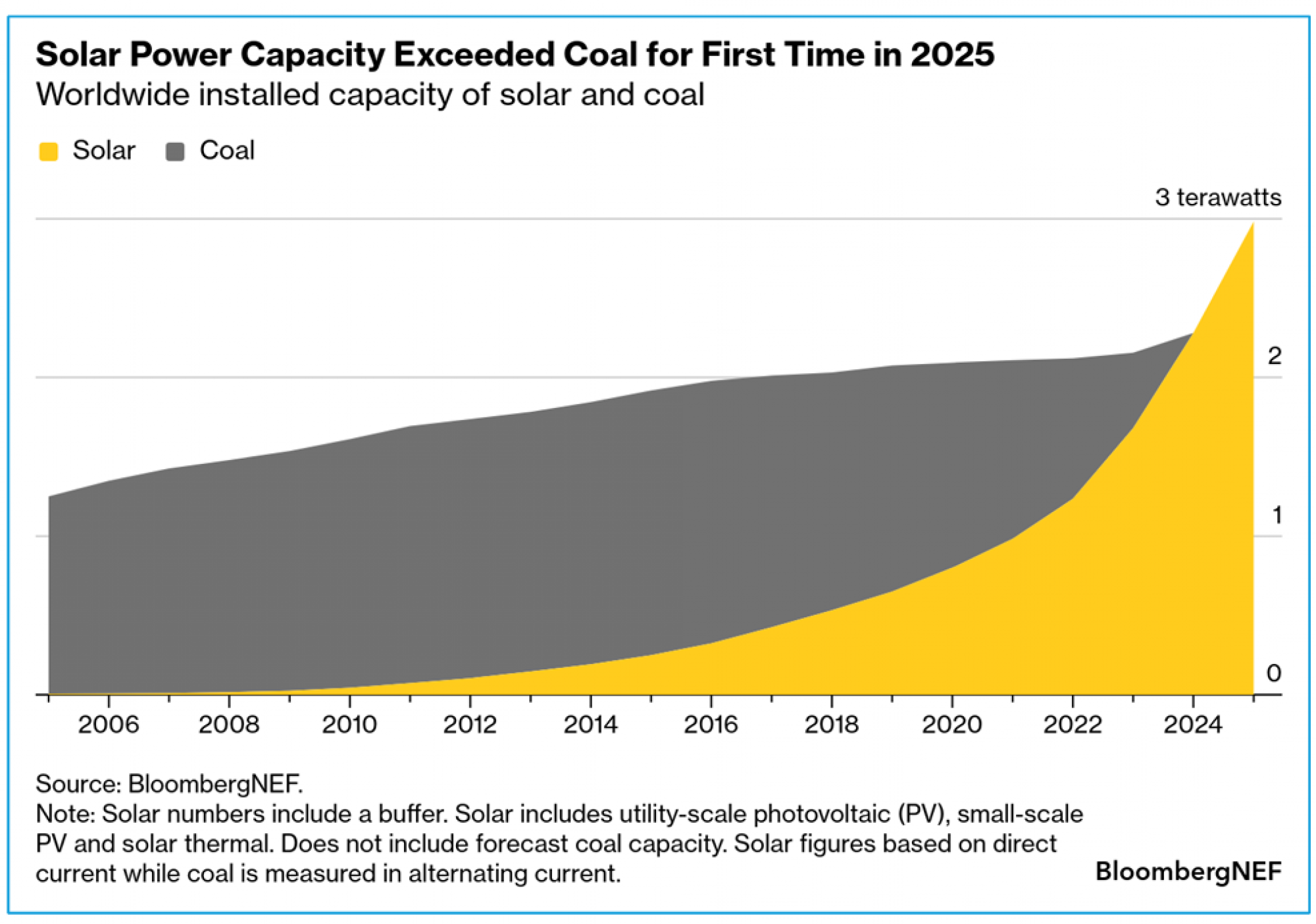Povjesničari će 2025. pamtiti kao godinu u kojoj je ukupni instalirani solarni kapacitet prvi put nadmašio kapacitet elektrana na ugljen.