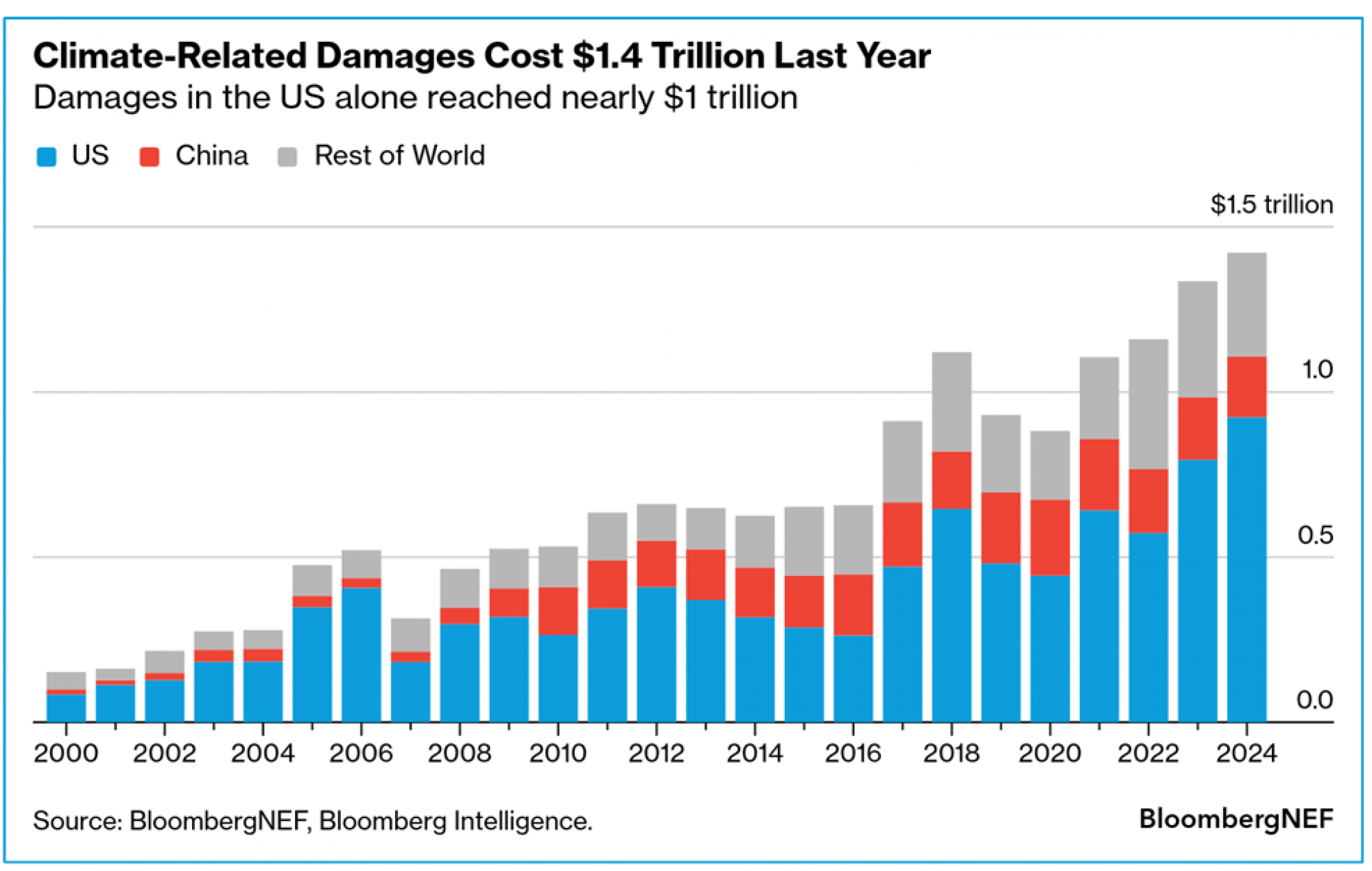 Stvarni troškovi klimatskih promjena rastu, možda i brže od ulaganja u rješenja. Osiguravatelji su prošle godine isplatili čak 1,4 bilijuna dolara za štete povezane s klimom, prema podacima Bloomberg Intelligencea. To je više nego dvostruko u odnosu na prije deset godina.