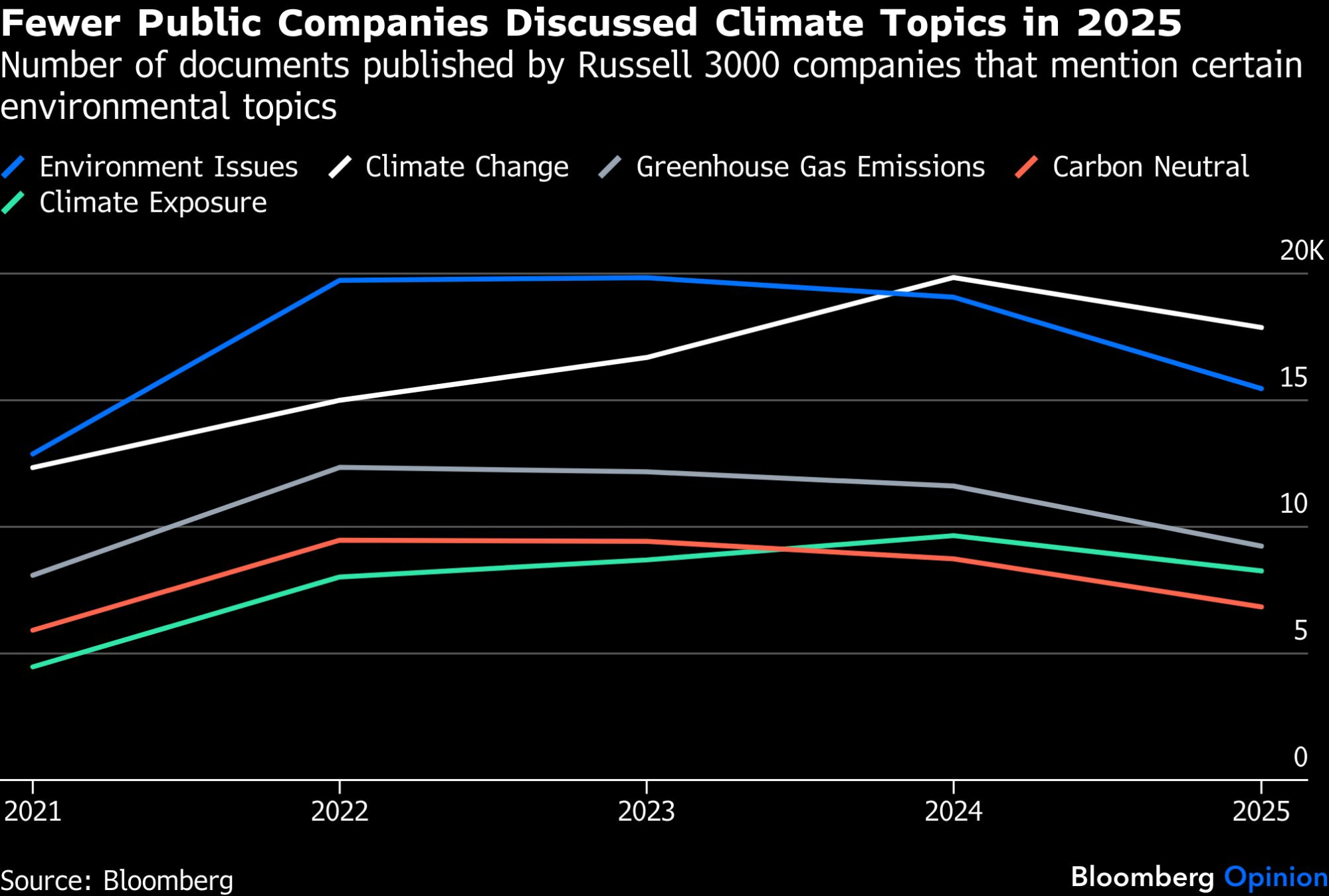 Broj dokumenata koje su objavile kompanije iz indeksa Russell 3000 u kojima se spominju određene okolišne teme | Bloomberg