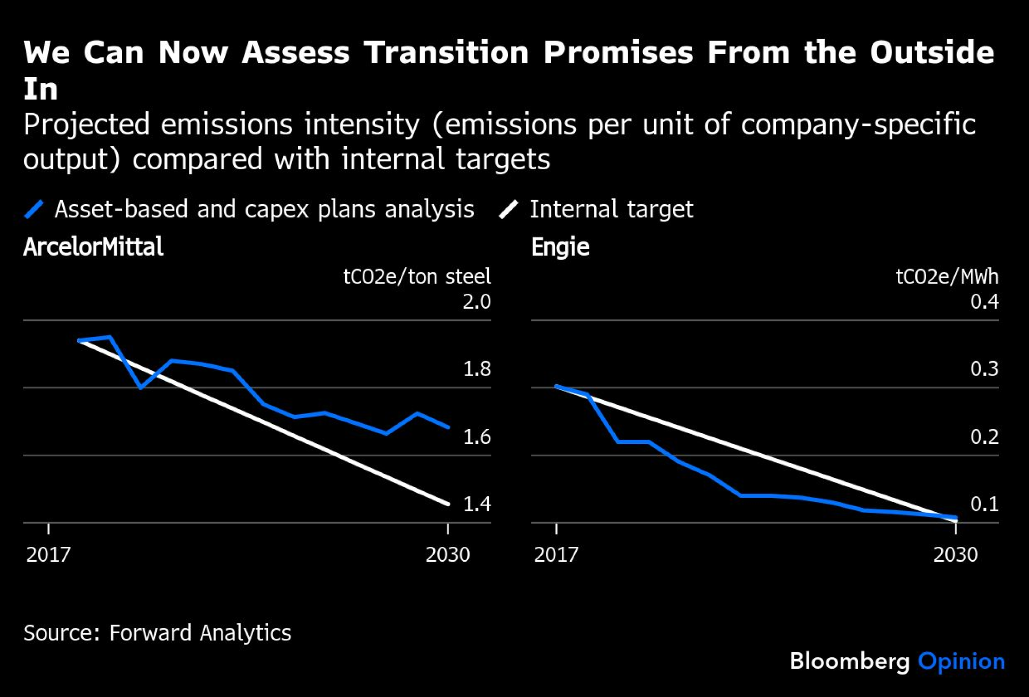 Kao primjer navodi ArcelorMittal, multinacionalnog proizvođača čelika koji planira smanjiti globalne emisije za 25 posto do 2030. u odnosu na nivoe iz 2018. Analiza Forward Analyticsa pokazuje da trenutni investicijski planovi zasad osiguravaju otprilike polovicu potrebnog smanjenja kako bi se taj cilj ostvario. Iz ArcelorMittala poručuju da ih takav nalaz ne iznenađuje. U prošlogodišnjem izvještaju o održivosti već su naveli da je malo vjerovatno da će dosegnuti cilj smanjenja emisija do 2030. godine.