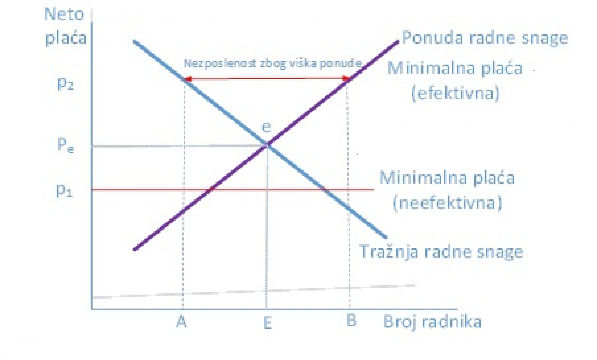Kad je minimalna plaća npr. p2 na dolje prikazanoj slici veća od ravnotežne plaće (plaće Pe pri veličini radne snage E), to vodi povećanju nezaposlenosti. Povećanje ponude radne snage i smanjenje potražnje za njom vodi povećanju nezaposlenosti, tj. otpuštanju radnika. Kad je minimalna plaća npr. plaća p1 ispod ravnotežne (plaća Pe), to nema utjecaja na tržište rada - tržište djeluje kao da i nema minimalne plaće.