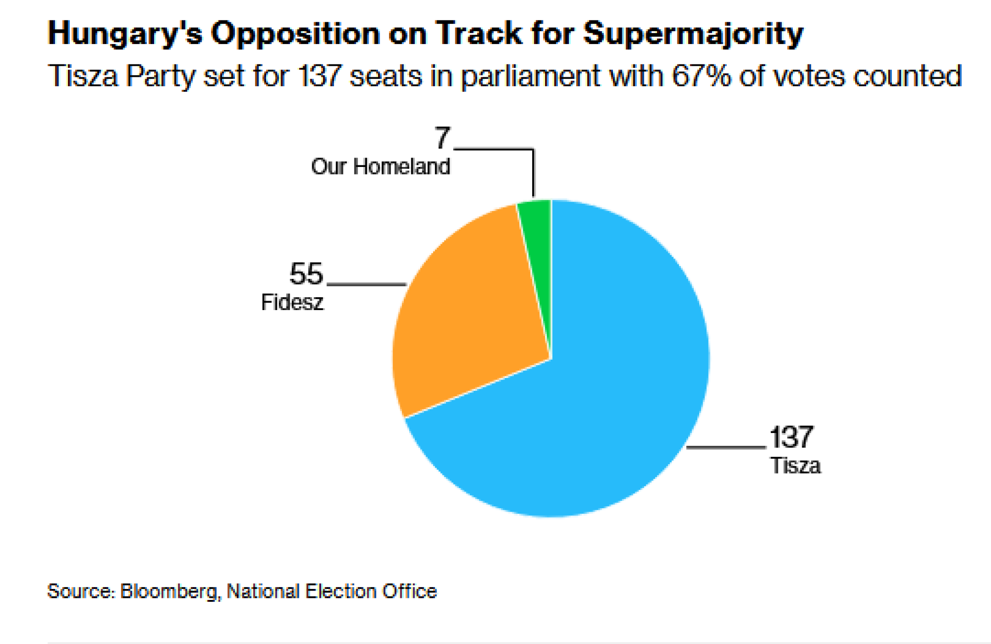 Tisza stranka Petera Magyara bila je na putu prema velikoj većini u parlamentu koja će joj omogućiti da ispuni smjela obećanja o demontiranju Orbanovog samozvanog neliberalnog sustava. Tisza je osvojio 69 posto parlamentarnih mandata u usporedbi s 28 posto za Orbanov Fidesz, prema podacima Izbornog ureda u Budimpešti u nedjelju, s prebrojanih 67 posto glasova.