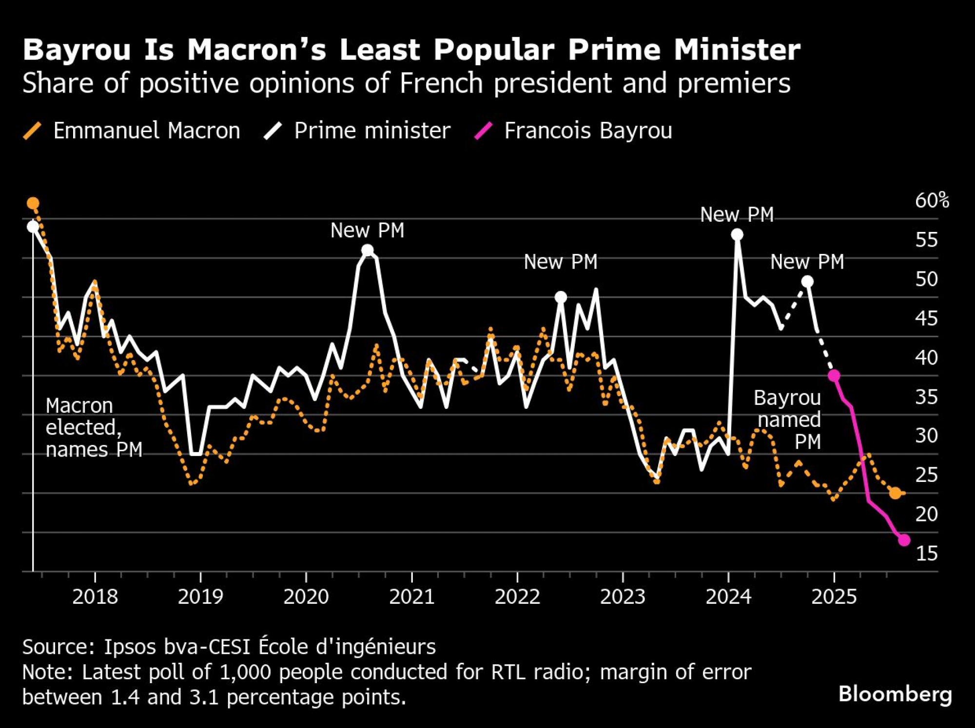 Ipak, krajem prošle sedmice tržišta su se smirila nakon što je postalo jasno da Macron želi da izbjegne nove vanredne parlamentarne izbore. Razlika u prinosima između francuske desetogodišnje državne obveznice i njemačke državne obveznice, ključni pokazatelj rizika, pala je za oko jedan bazni poen, na 78, nakon što je Bloomberg objavio informacije o Macronovim namjerama. Ta razlika je iznosila oko 70 prije nego što je Bayrou najavio glasanje o povjerenju.
