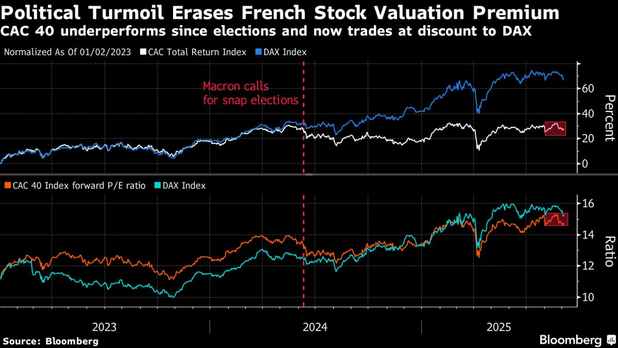 Od kada je Macron šokirao Francusku raspisivanjem vanrednih izbora u junu 2024, čime je stvorio trenutni politički zastoj, indeks CAC 40 pao je za 4,1 odsto. U poređenju s tim, indeks Stoxx Europe 600 porastao je za 4,9 procenata, dok je njemački indeks DAX (bez uračunatih dividendi) zabilježio rast od 24 odsto.