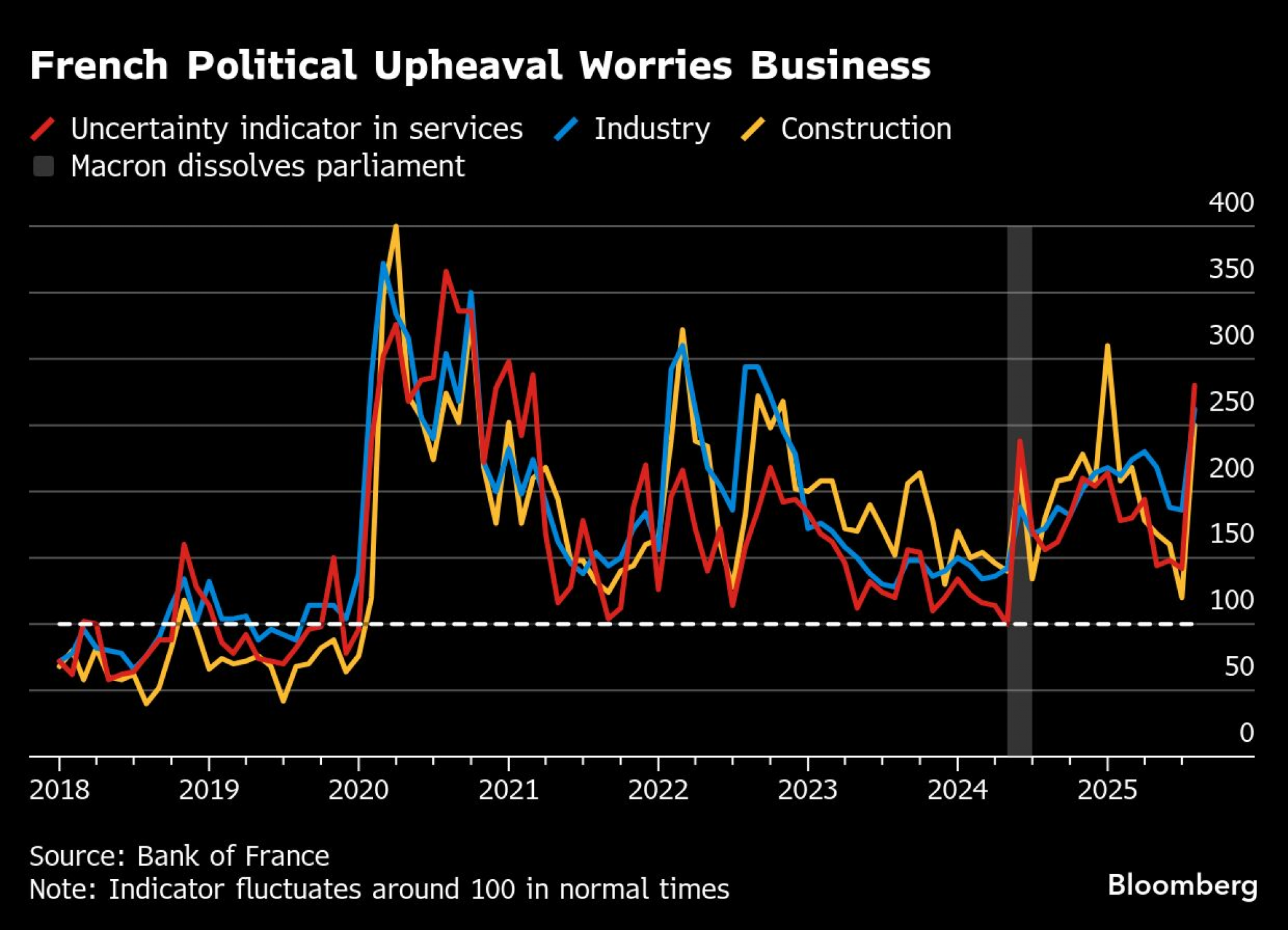 Gospodarstvo je pokazalo iznenađujuću otpornost na političke potrese posljednjih mjeseci, s pokazateljima da se industrija oporavila od dugotrajnog pada, a rast nadmašio očekivanja u drugom tromjesečju. Međutim, anketa Banke Francuske provedena oko Bayrouove najave glasanja o povjerenju pokazala je nagli porast neizvjesnosti među poslovnim liderima, usporediv s onim nakon Macronova raspuštanja parlamenta.