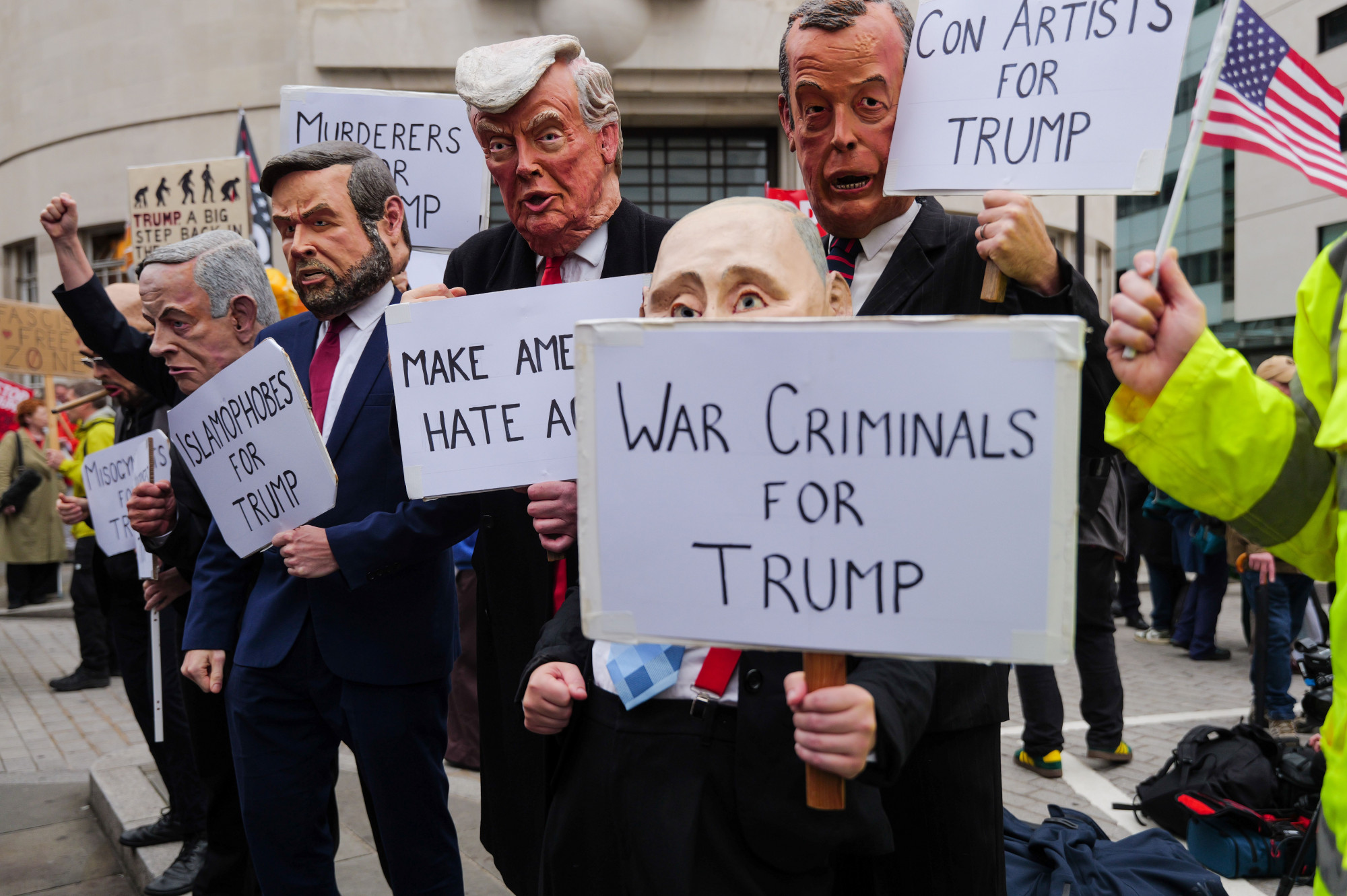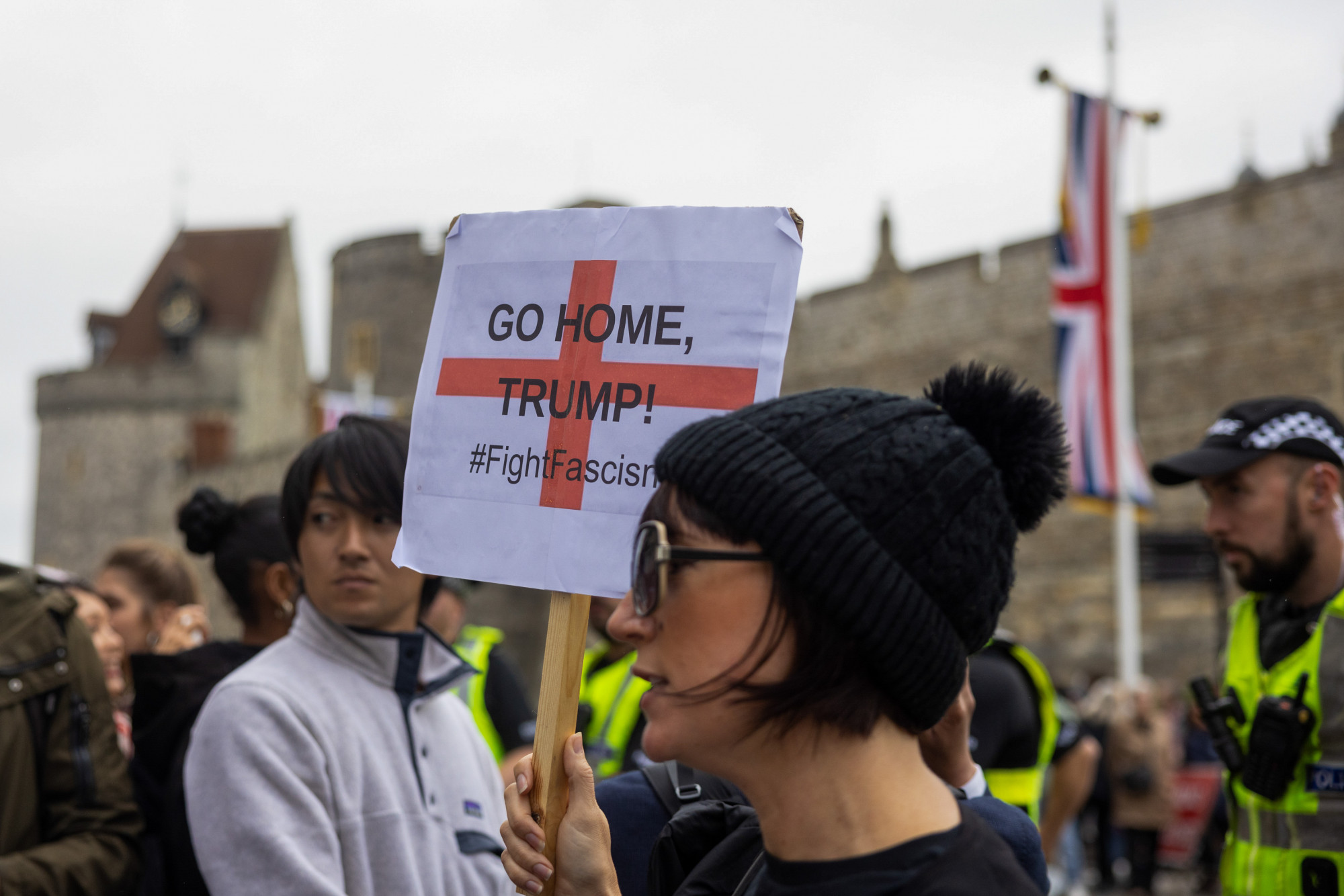 Iako je policijsko obezbjeđenje posjete izuzetno obimno i jako, demonstranti su u utorak uveče izveli akciju u Vindzoru, gdje su na zidinama jedne od kula Vindzorskog zamka projektovali fotografije Epsteina sa Donaldom i Melanijom Trump. Policija je saopštila da su četiri osobe uhapšene zbog te "zlonamerne komunikacije", a da će 1.600 policajaca biti raspoređeno u Vindzoru i Londonu zbog demonstracija koje organizuje koalicija "Zaustavite Trumpa".