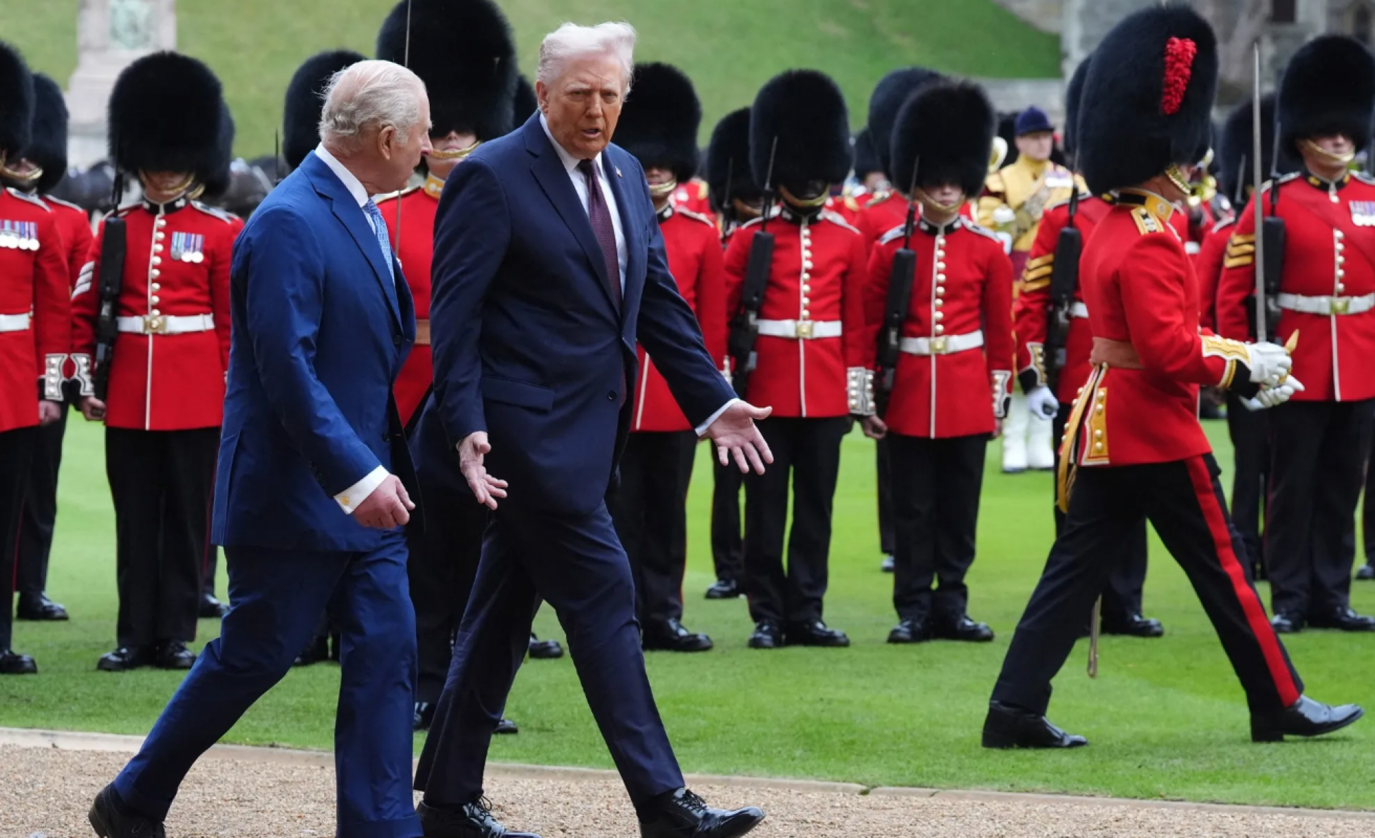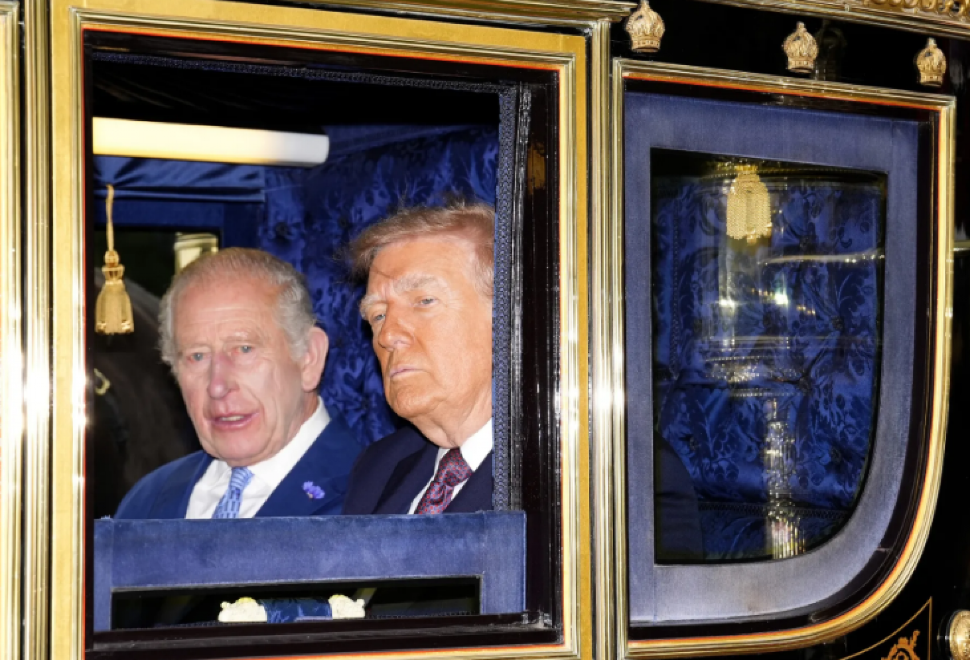 Trumpa i njegovu suprugu najpre je dočekao kraljev, kako ga je svojevremeno nazvao predsjednik SAD, "veoma zgodan" sin, princ prijestolonaslednik William i njegova supruga Kate. Potom su im se pridružili kralj Charles i kraljica Camilla, sa kojima su se Trumpovi provozali kraljevskim kočijama po imanju u Vindzoru, duž rute koju je oivičilo 1.300 britanskih vojnika.