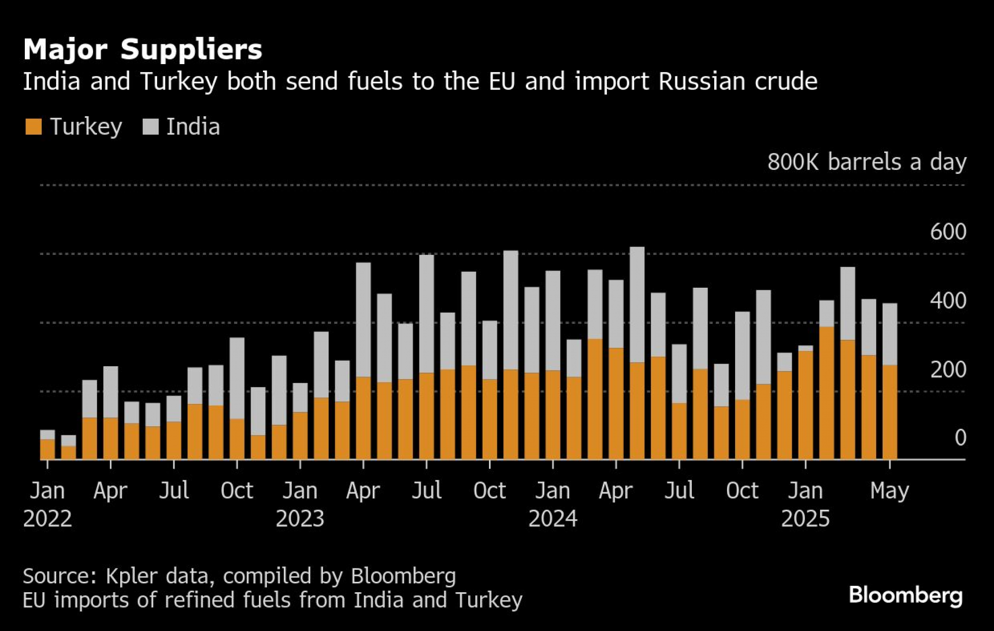 Gotovo sve članice EU prestale su kupovati rusku naftu koja se doprema morskim putem i cjevovodima. Mađarska i Slovačka, koje uvoze rusku naftu preko naftovoda Družba, ostale su izuzetak. EU razmatra trgovinske mjere kako bi se ciljale te preostale isporuke ukoliko Budimpešta i Bratislava ne usvoje planove izlaska, izvijestio je Bloomberg u subotu.