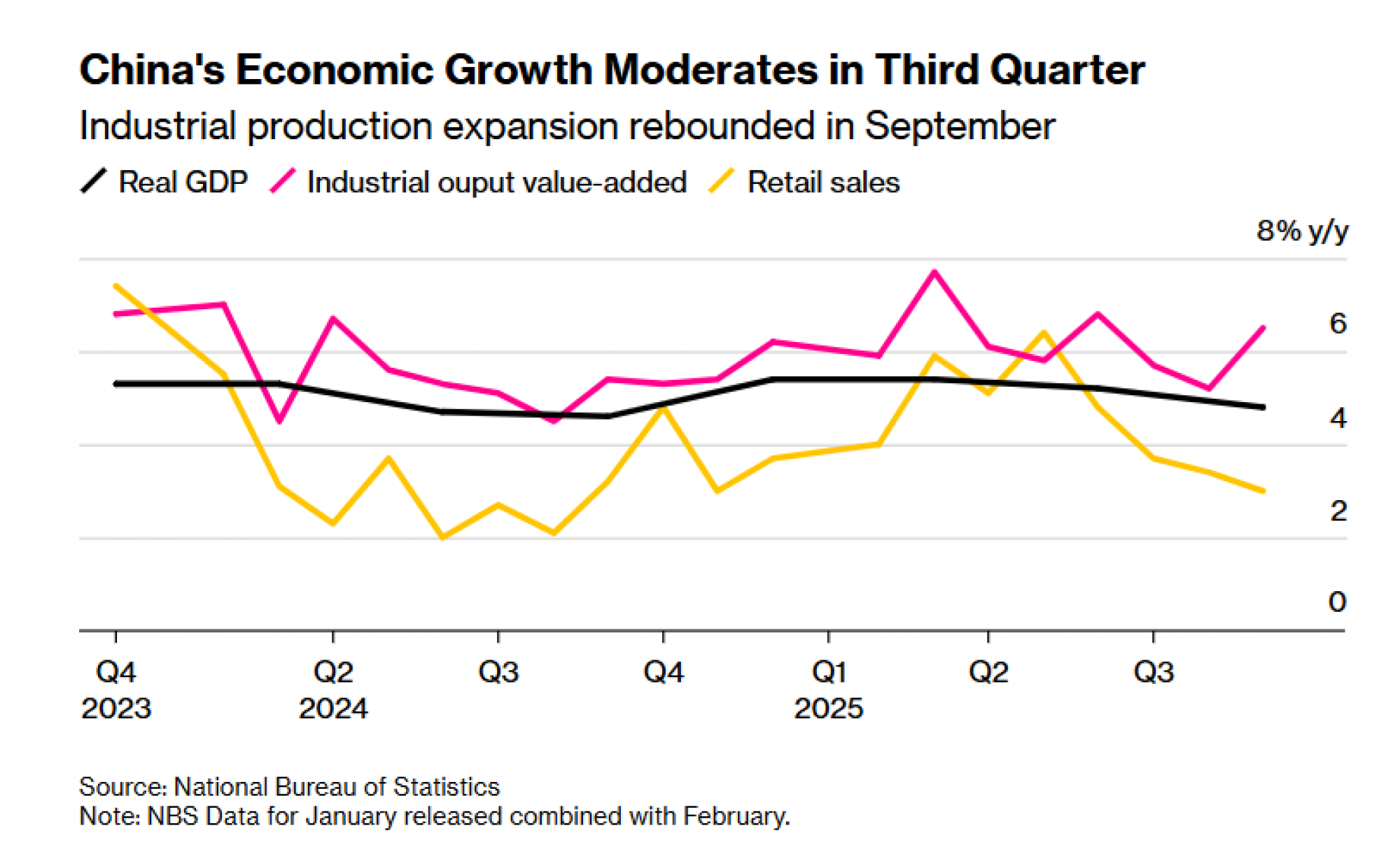 Međutim, podaci od ponedjeljka pružili su dovoljno razloga za oprez. Maloprodaja je zabilježila najsporiji rast od novembra, dok su ulaganja u fiksnu imovinu pala od početka godine prvi put od 2020. Ovu slabost ublažio je neočekivani rast industrijske proizvodnje, koja je u septembru porasla za 6,5 posto, nadmašivši sva očekivanja ekonomista.