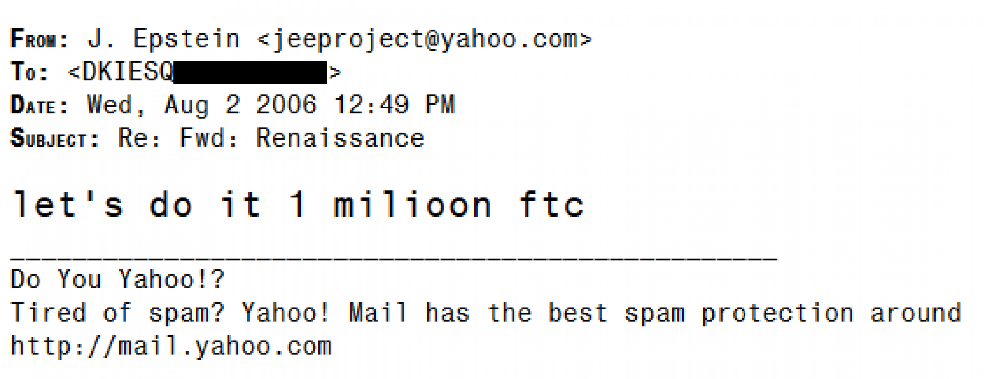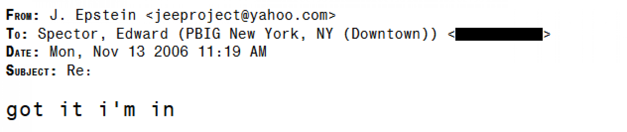 E-poruka ne otkriva što je Epstein želio, ali je nastavio vršiti pritisak na savjetnika. Spector je odgovorio: "Jeffrey, kao što znaš, imam veliko poštovanje prema tebi. Raspitivao sam se danas poslijepodne o temi koju si spomenuo u svojoj e-poruci, bez otkrivanja imena, i upozoren sam da bih mogao biti u ozbiljnoj nevolji ako pokrenem tu temu. Nadam se da razumiješ.“