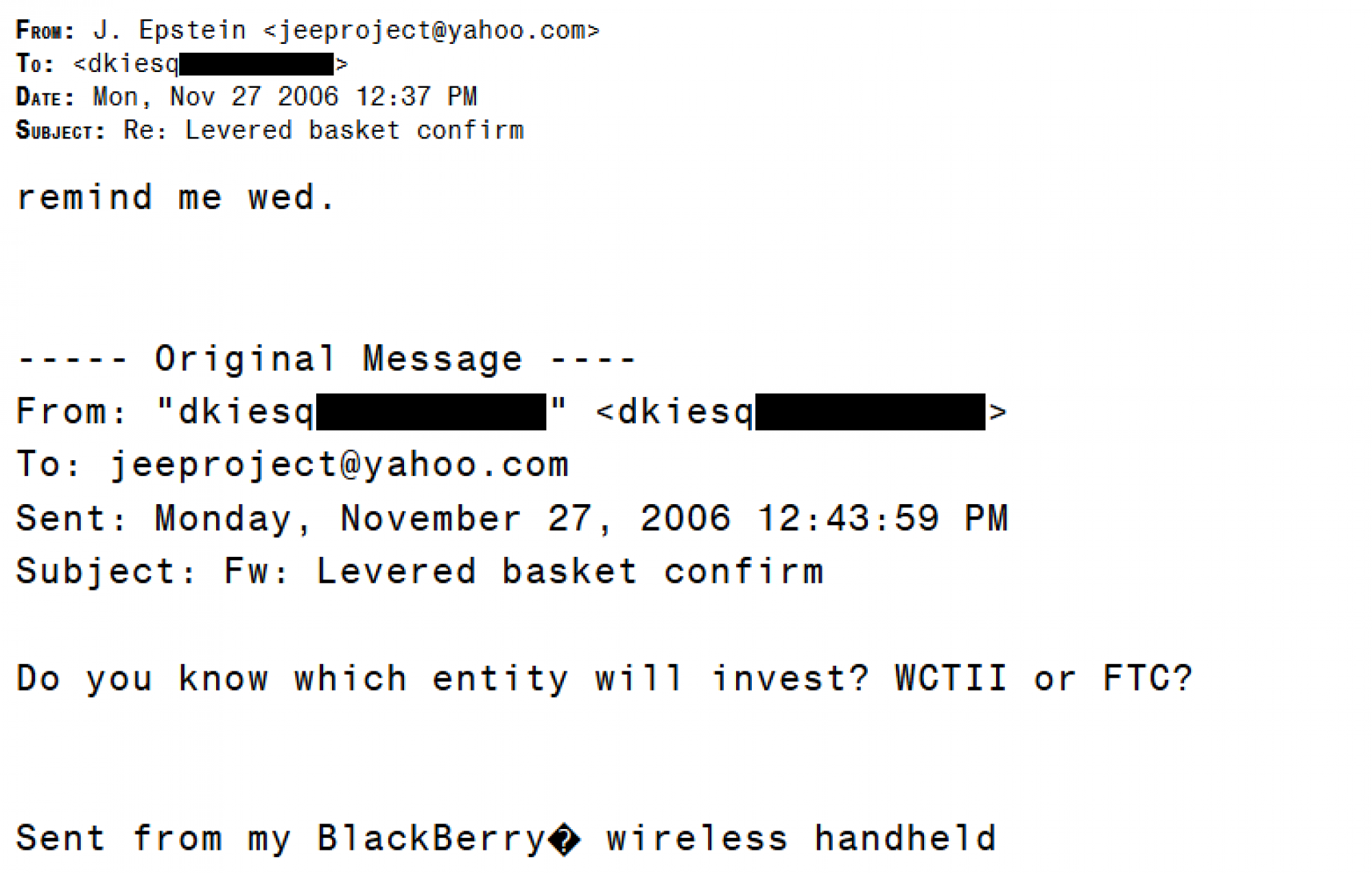 Krajem 2006. godine, kada je Indyke proslijedio pitanje o tome je li pojedinačna investicija u vrijednosne papire – "košarica s 3x leverageom" - namijenjena obiteljskom trustu Wexner ili Epsteinovoj tvrtki, Epstein je uputio svog odvjetnika da ga na to podsjeti za nekoliko dana.