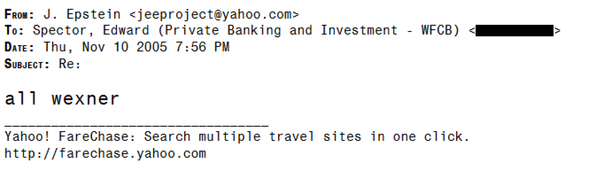 Za financijskog savjetnika u Merrill Lynchu po imenu Ed Spector, ova fluidnost bila je uobičajena. Godine 2005. poslao je Epsteinu podsjetnik o vremenskom okviru za ulaganje za Wexnerovu suprugu. Nekoliko dana kasnije, savjetovao je Epsteina o poslu za financijski trust. U studenom te godine, u e-poruci o planu za kupnju australskog dolara i prodaju novozelandskog dolara, Spector ga je također pitao želi li podijeliti 10 milijuna dolara između trusta i Wexnera.