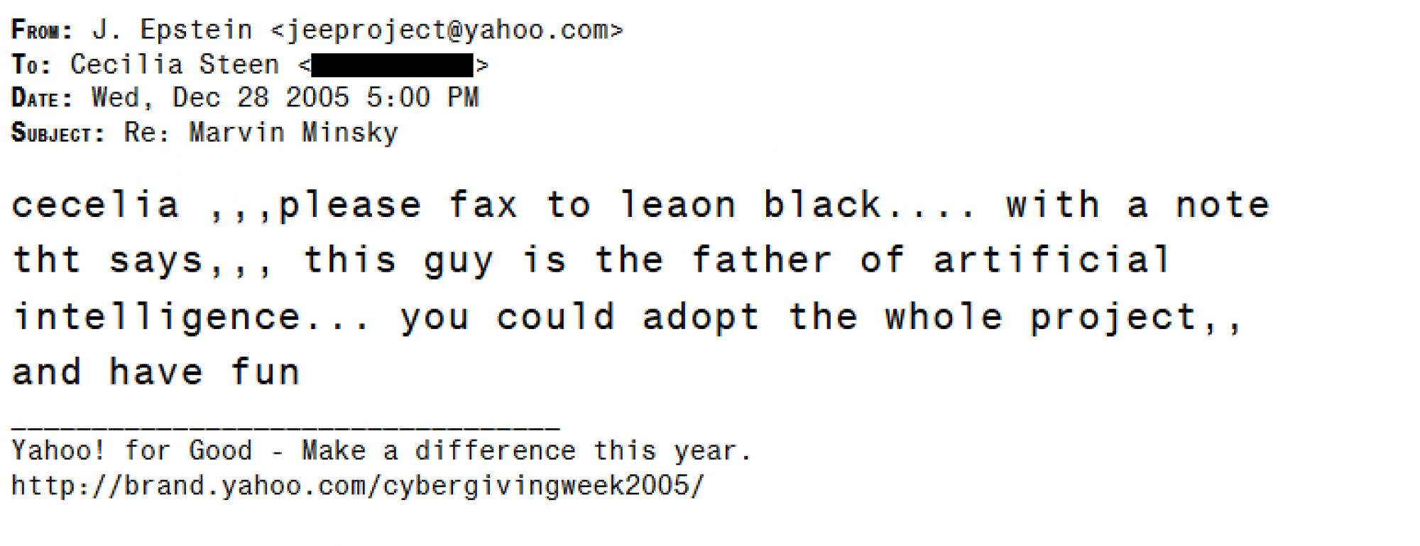 Krajem 2005. godine, znatno prije nego što je umjetna inteligencija postala opsesija globalnog kapitalizma, Epstein je imao ideju za Leona Blacka, suosnivača Apollo Global Managementa. Marvin Minsky, istaknuti računalni znanstvenik na MIT-ju, radio je s kolegama na projektu "izgradnje stroja sposobnog za razmišljanje zdravim razumom, onog koji bi rješavao stvarne probleme za stvarne ljude", prema jednom od e-poruka. Njihov prijedlog bio je stvoriti neprofitnu organizaciju s profitabilnim spin-off tvrtkama. Epstein je pitao svog asistenta: