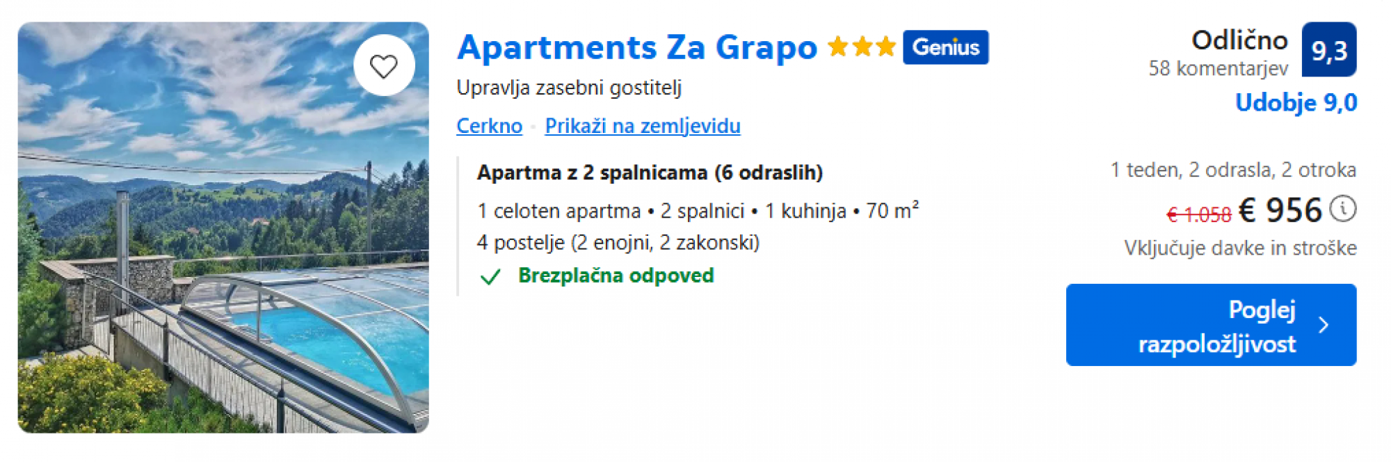 Rogla ostaje jedno od popularnijih odredišta za obitelji. Cijene tjednog najma apartmana s tri ili četiri zvjezdice, prema podacima s Bookinga, trenutačno se kreću između tisuću i 1.500 eura. Ipak, primijetili smo i zanimljive snižene ponude – četveročlana obitelj može, uz pravodobnu rezervaciju, na Rogli boraviti već za oko 500 eura.