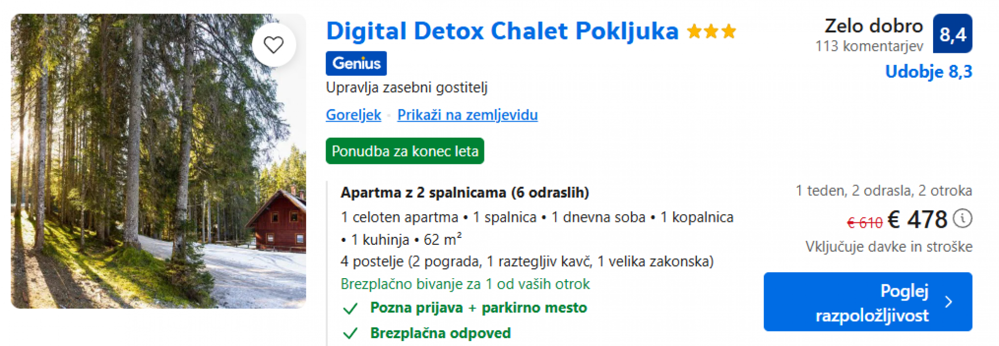 Pokljuka postaje zanimljiva alternativa poznatijim i posjećenijim skijalištima. Smještaj je cjenovno pristupačan – većina ponuda ne prelazi tisuću eura, a mnoge su dostupne za 400 do 800 eura. Pronašli smo i idiličnu drvenu kućicu u kojoj obitelj može boraviti cijeli tjedan za manje od 500 eura.