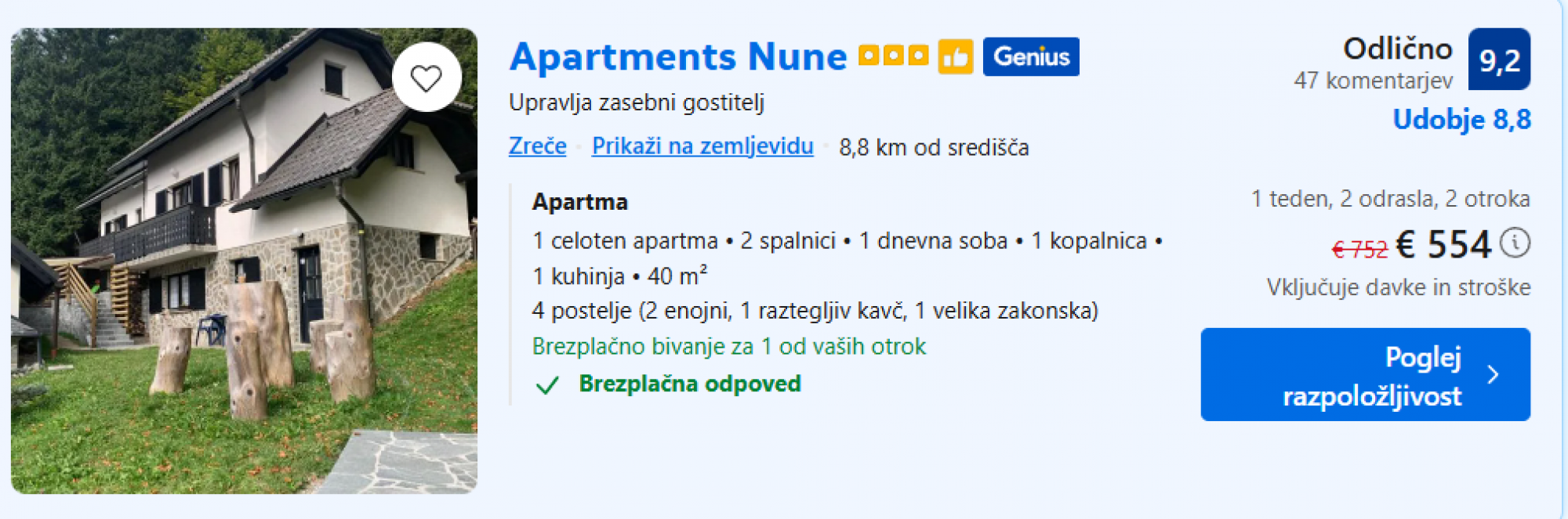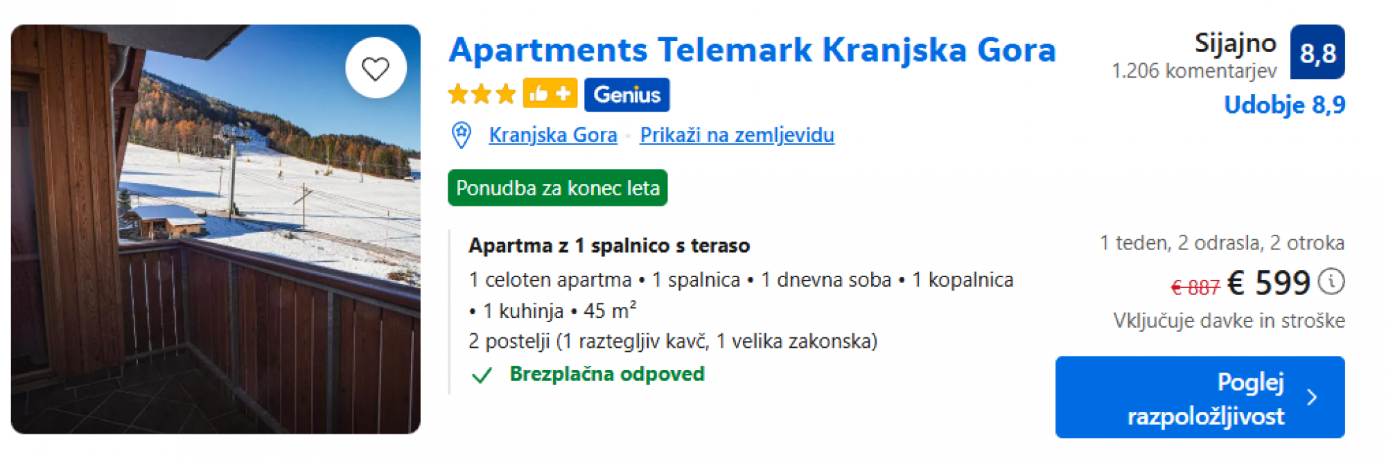 U Kranjskoj Gori, gdje je ponuda često usmjerena na srednji i viši cjenovni razred, cijene smještaja u prosjeku počinju od tisuću eura tjedno. No konkurencija i sezonski popusti vidljivi su – brojne su ponude trenutačno snižene i do 30 %, što znači da obitelj može tjedan dana u prosincu provesti na snijegu već za oko 600 eura.
