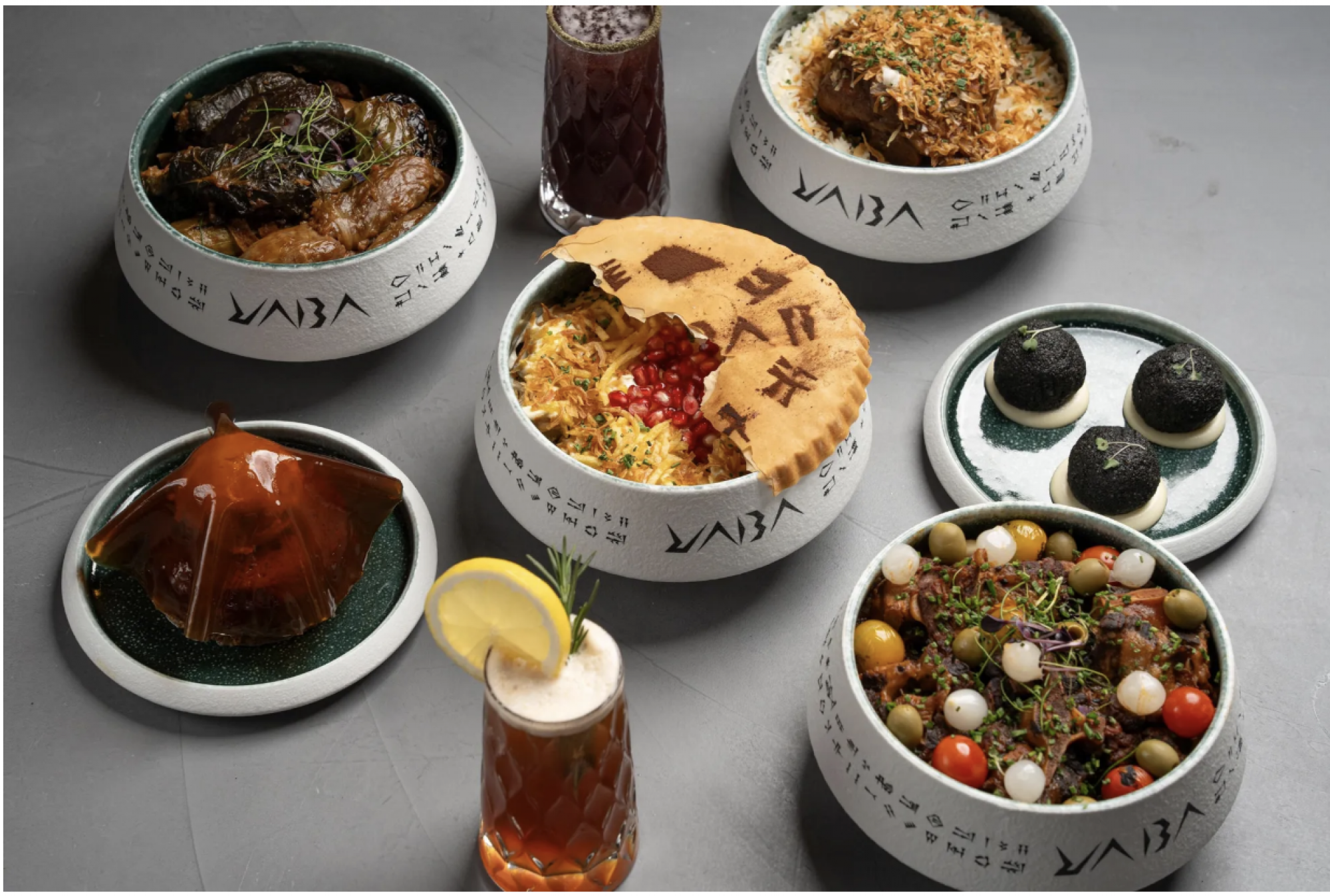 Večera počinje domaćim čipsom i juhom od leće kao poklonom kuhara. Slijede specijaliteti poput crne salate (48 AED) s patlidžanom i fetom preko rajčice i zelenog lisnatog povrća, uz dimljene dolme (120 AED), ili jela "stara 800 godina" – rumania: kratka rebra Angus govedine kuhana u soku od nara s rižom (128 AED). Hrana je raskošna, a prezentacija jednako dojmljiva – jela se poslužuju na tanjurima ukrašenim Kufi kaligrafijom. yabarest.com