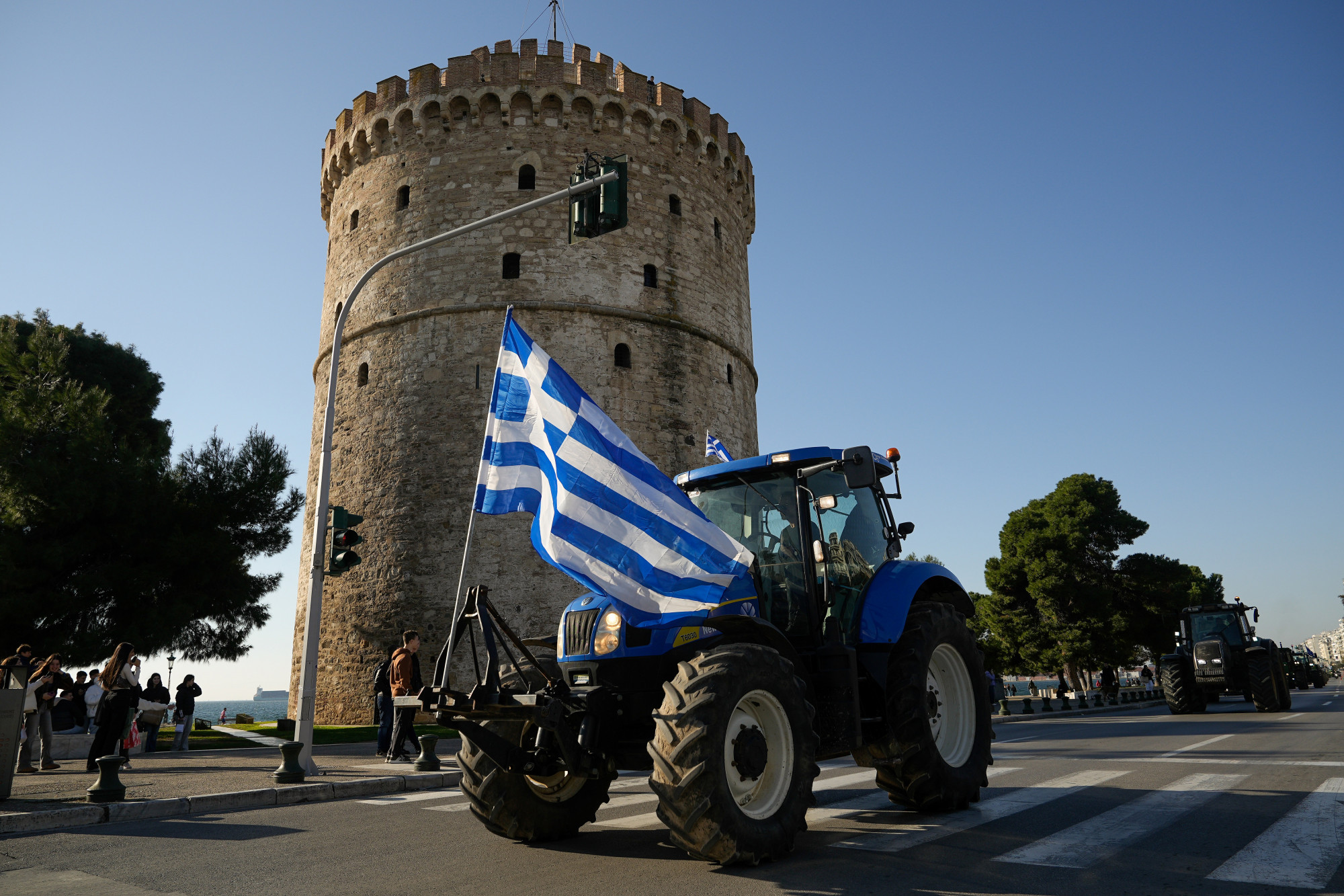 Grčki farmeri voze traktore pored Bele kule tokom demonstracija protiv kašnjenja isplata iz EU u Solunu, 12. decembra 2025. | Konstantinos Tsakalidis/Bloomberg