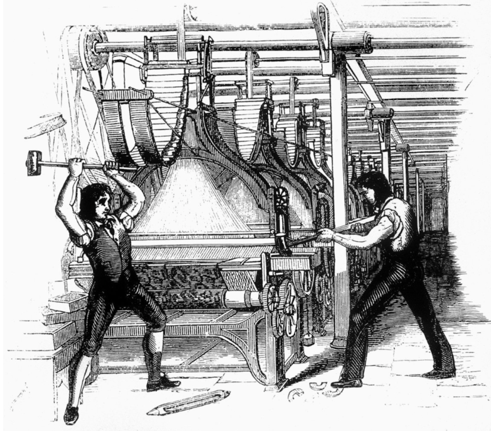 Luditi - tekstilni radnici koji su iz revolta organizovano razbijali mašine smatrajući da tehnologija ugrožava njihove poslove| Javni domen
