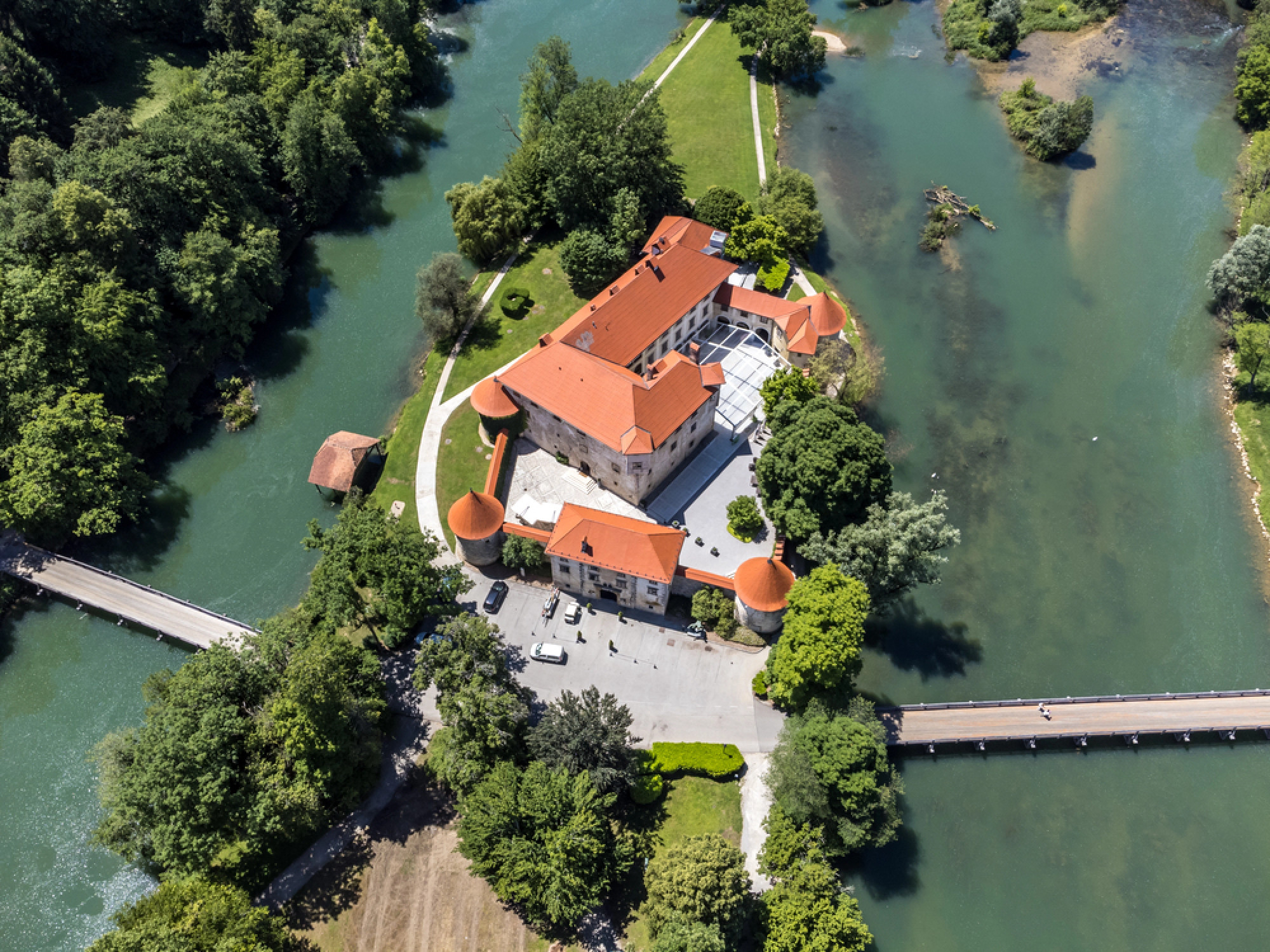 "Ne spavate svake noći u pravom zamku. Bivši dvorac, pretvoren u butik-hotel, skriven je na ostrvcu usred rijeke Krke, što ga čini jedinim 'vodenim zamkom' u Sloveniji i jednim od najneobičnijih smještaja", navode u vodiču.