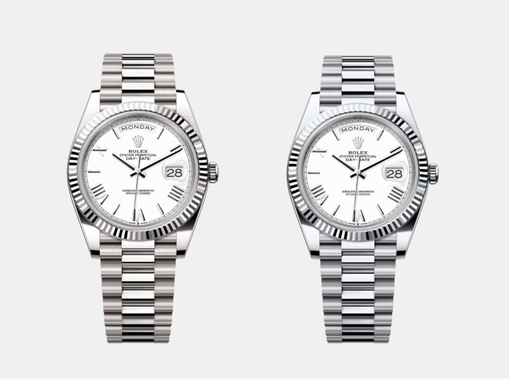 S lijeve strane je Rolex Day-Date od bijelog zlata, prečnika 40 mm, model 228239, čija je maloprodajna cijena 51.600 dolara. S desne strane je Rolex Day-Date od platine, također prečnika 40 mm, model 228236, s maloprodajnom cijenom od 68.800 dolara.