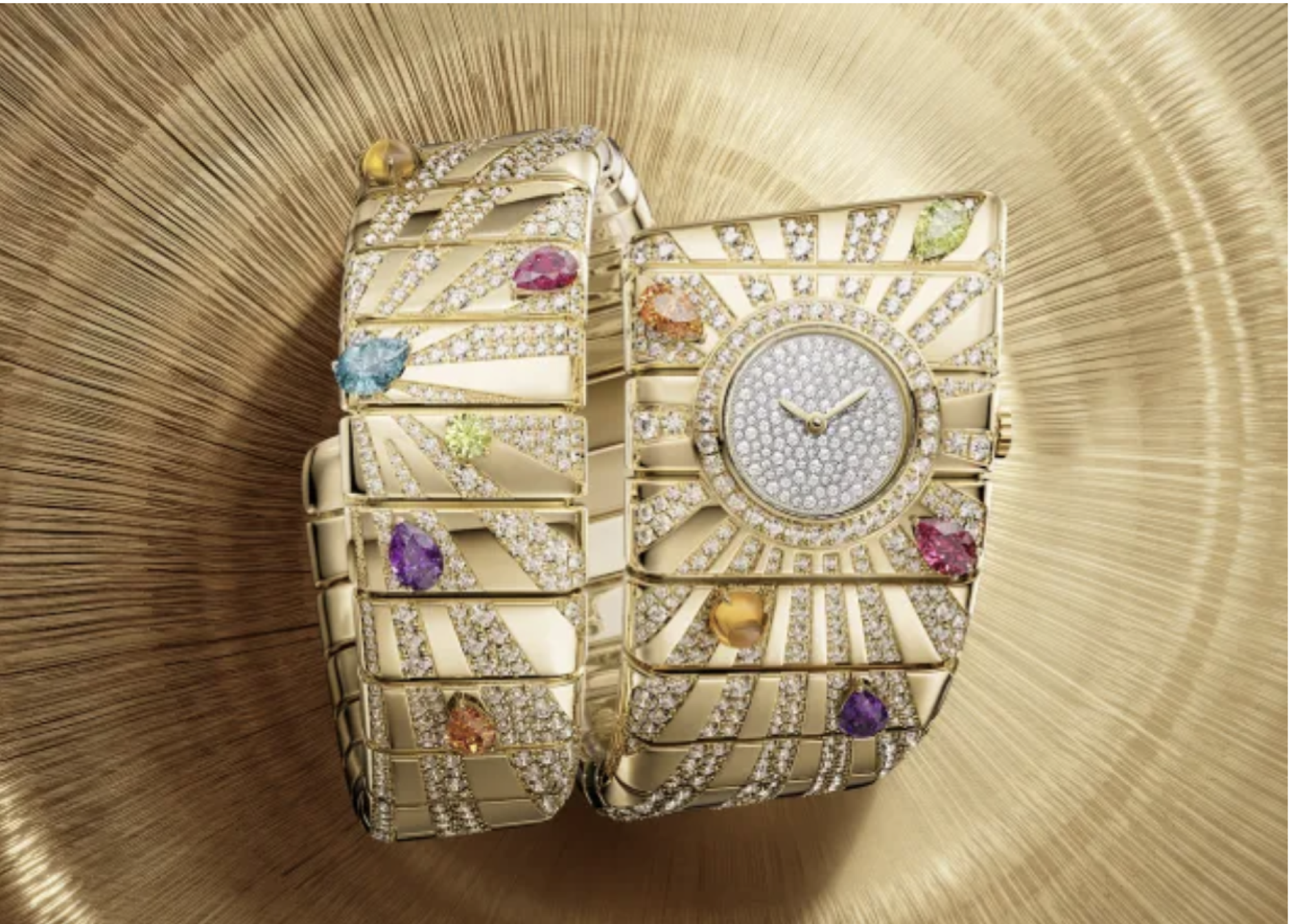 Drugi Bulgari model koji mi se dopao ove nedjelje je Tubogas Manchette, koji koristi novu, širu verziju njihovog metalnog Tubogas stila sa spiralama, koja oživljava arhivski model iz 1974. Ovaj model sadrži citrine, rubelite, peridote, ametiste, topaze, garneta i čitav niz dijamanata na poliranim spiralama. Sav taj bling koštaće vas 190.000 dolara.