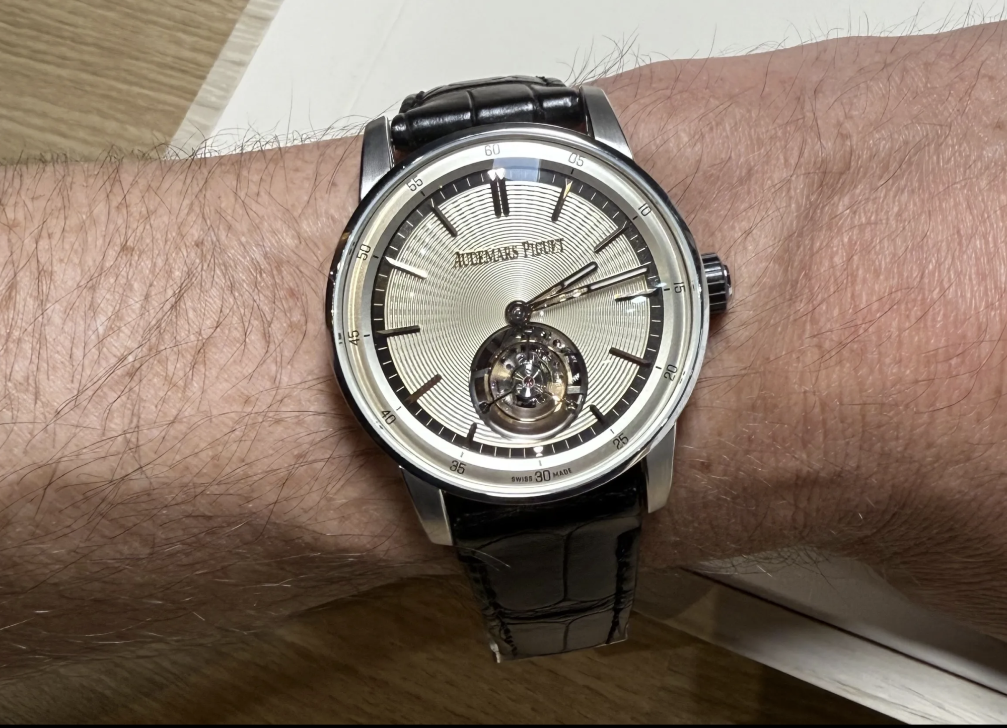 U jednom trenutku, direktor muzeja i nasleđa AP-a, Sébastian Vivas, izašao je sa perikom i brkovima Alerta Einsteina i govorio o različitim kvalitetima protoka vremena. Vježbao sam veštinu ručnog fazetiranja komponente (bila sam veoma loš) i koristio ručni bušilicu za teksturiranje koju majstori koriste da naprave AP-ov "frosted gold" finiš na nekim satovima - što je, srećom, nešto što oprašta greške.
