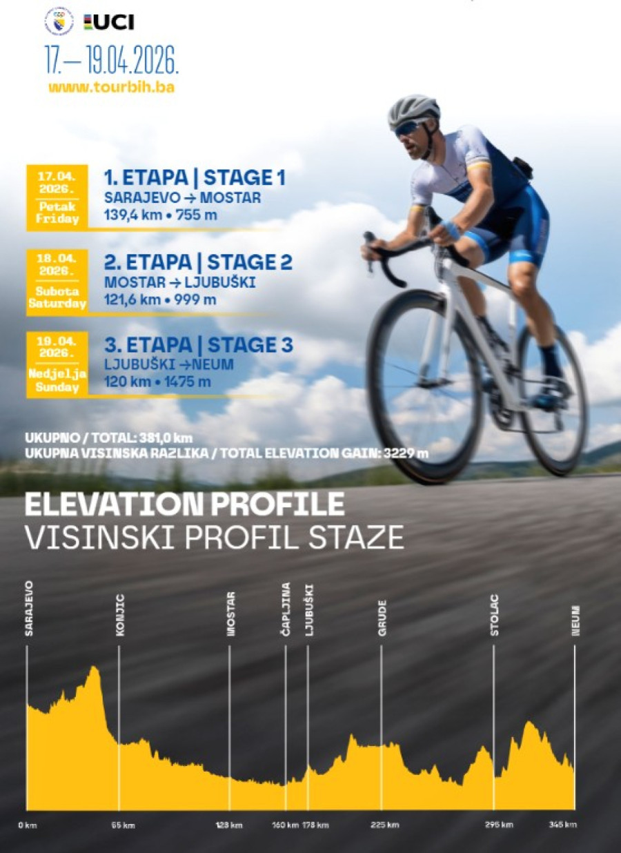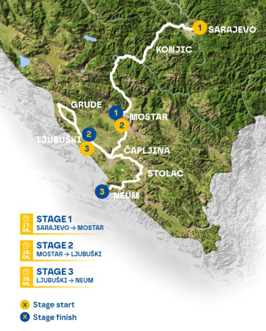 Prva etapa, duga 148 kilometara, mogla bi biti jedna od najbržih u profesionalnom biciklizmu, s procijenjenim prosjekom većim od 48 km/h, dok završnica u Mostaru uključuje kružnu vožnju kroz grad uz televizijski spektakl iz zraka.