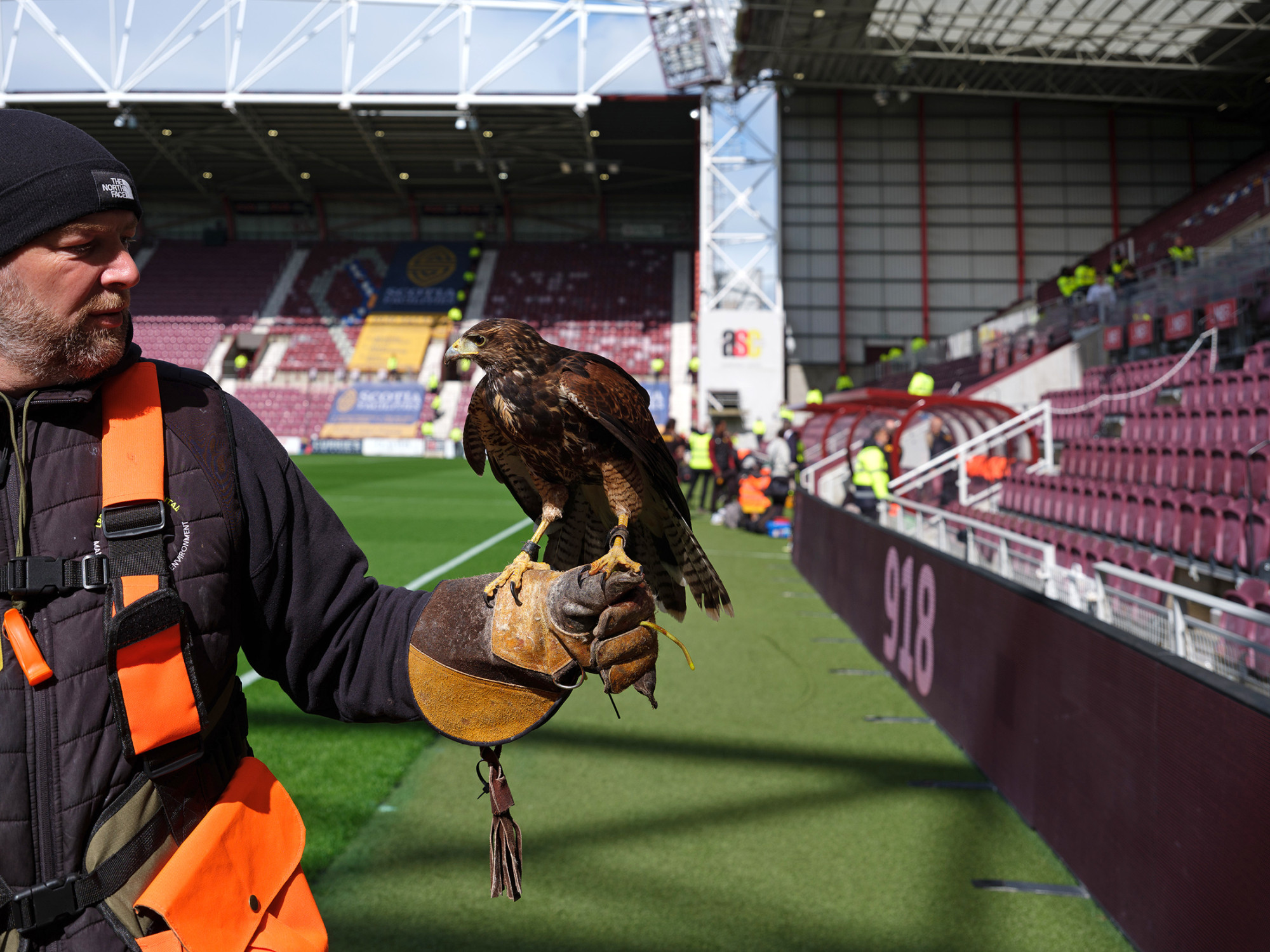 Bloomberg -Rocky, Harrisov jastreb, koji odvraća ptice od okupljanja na terenu ili na tribinama stadiona
